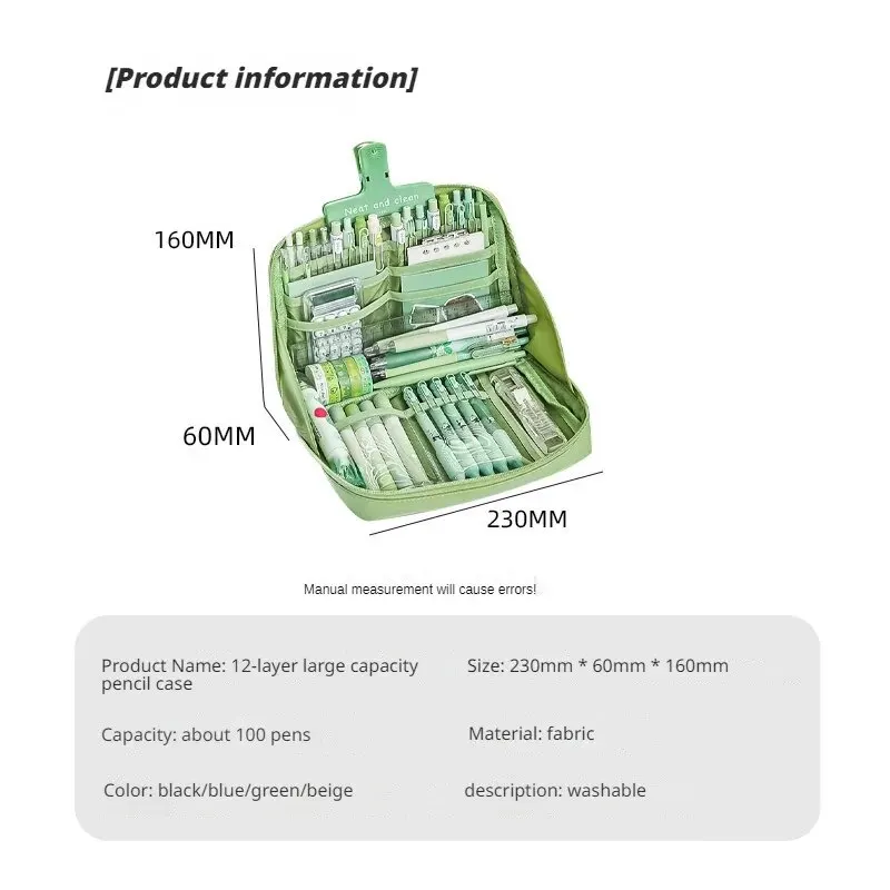 Look no further than our 12-layer pencil bag! With its transparent compartments and versatile design, our pencil bag is perfect for organizing all your writing essentials on-the-go. It's not just cute and eye-catching, it's also great for everyday use- whether you're a primary school student or high schooler. Featuring high-quality construction and a durable design, our pencil bag is built to withstand the wear and tear of everyday use. So if you're looking for a practical and fashionable accessory, our pencil bag is the ideal choice.