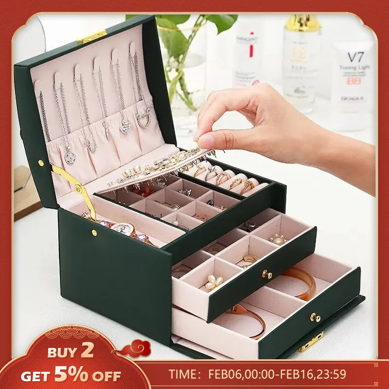 1pcs Multi Functional Three Layer Leather Drawer Style Jewelry Box Earrings Earrings Lock Jewelry Box