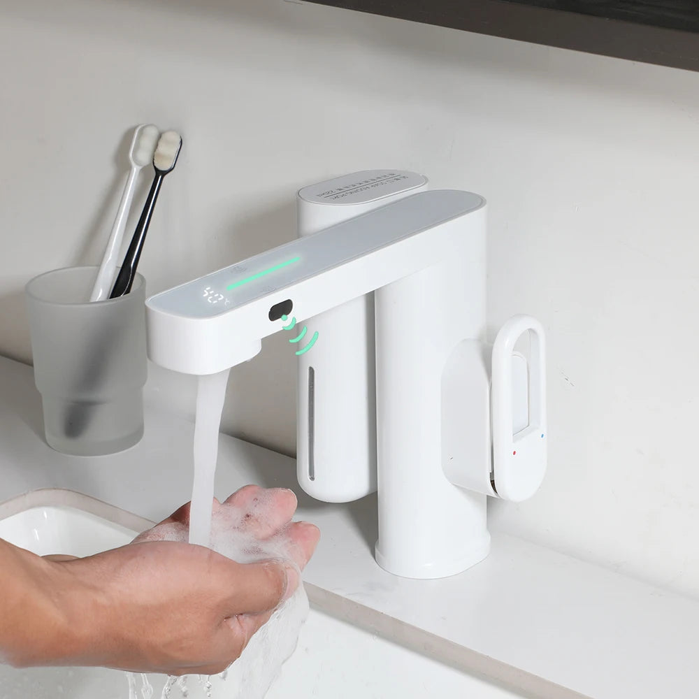 2 In 1 Set Bathroom Basin Sensor Faucet With Foam Soap Dispenser Deck Mounted Single Hole Touch Free Hot Cold Water Outlet Mixer Taps Home Bathroom Kitchen Accessories