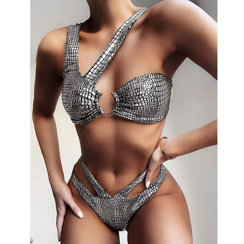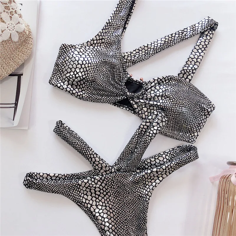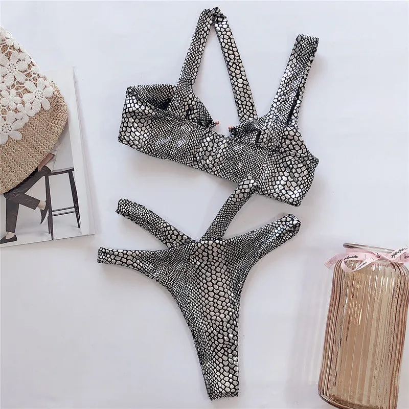 Sexy Snake Print Shiny Thong Bikini Female Swimsuit Women Swimwear Brazilian Bikini set Asymmetric Bather Bathing Suit Swim