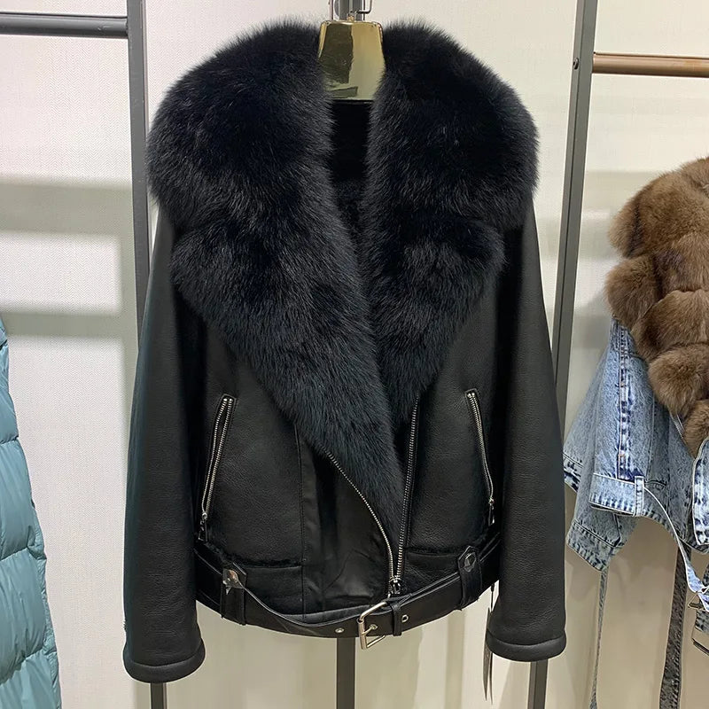 Real Shearling Jacket Real Fox Fur Collar Cuff Coats Women Winter Overcoats Genuine Sheepskin Leather Jacket