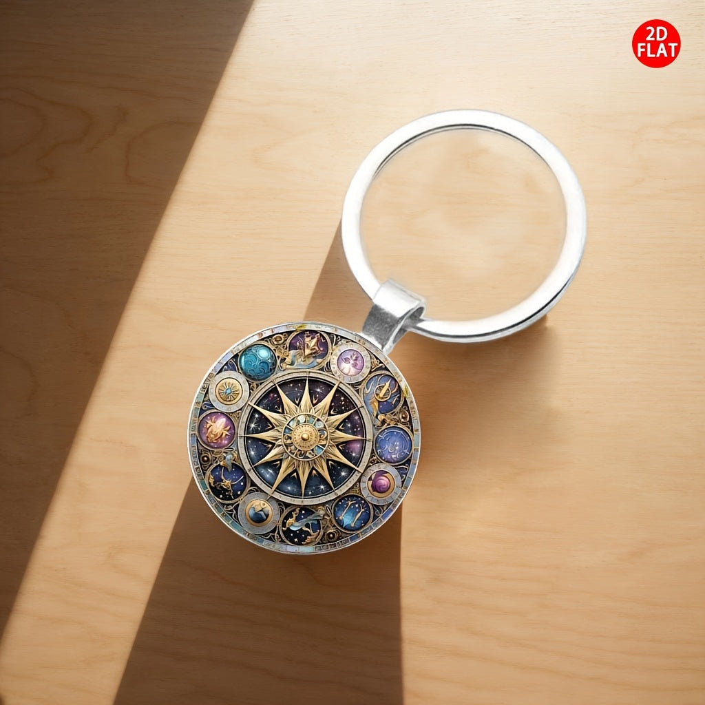 2D Flat Retro Celestial Keychain - Sun, Moon & Stars Design with Zodiac Signs, Fashionable Accessory for Men & Women, Ideal for Bags & Car Keys, Perfect Gift for Thanksgiving, Anniversaries & Holidays, Celestial Theme, Metall