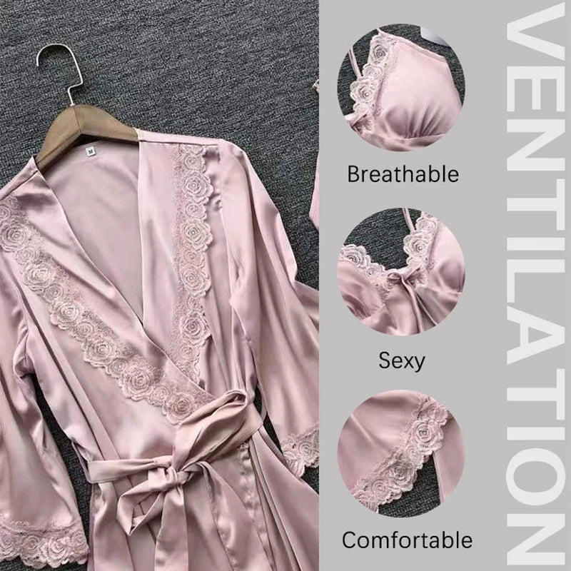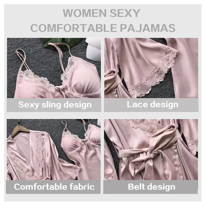 2pcs Woman Sexy Pajamas Sleepwear Lace Robe And Pants Lingerie Bathrobe Silk Satin Home Clothed Nightwear For Ladies