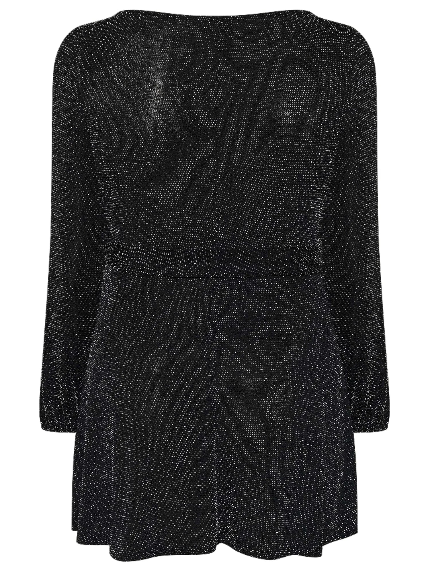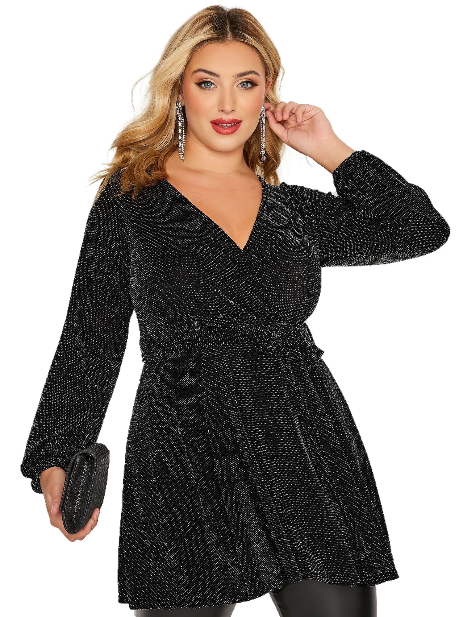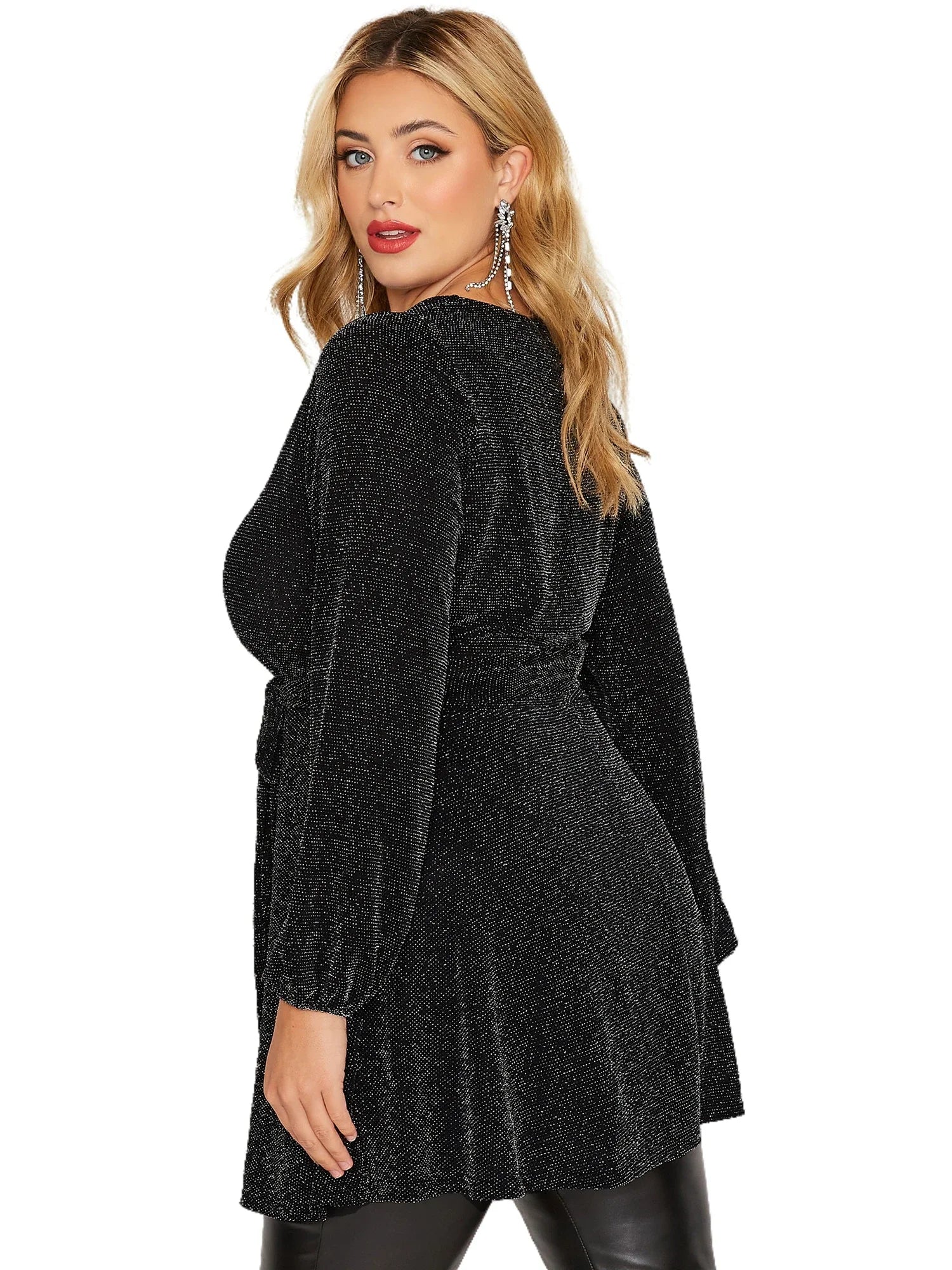 2XL-8XL UK Plus Size For Curvy Ladies Elegant Spring Autumn Wrap Top Women Long Sleeve Sexy V-Neck Black Glitter Blouse Sashes Waist Plus Size Clothing