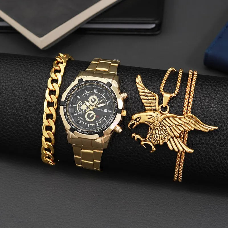 3PCS Set Luxury Fashion Mens Watches Men Business Quartz Watch Male Casual Necklace Bracelet Wristwatch