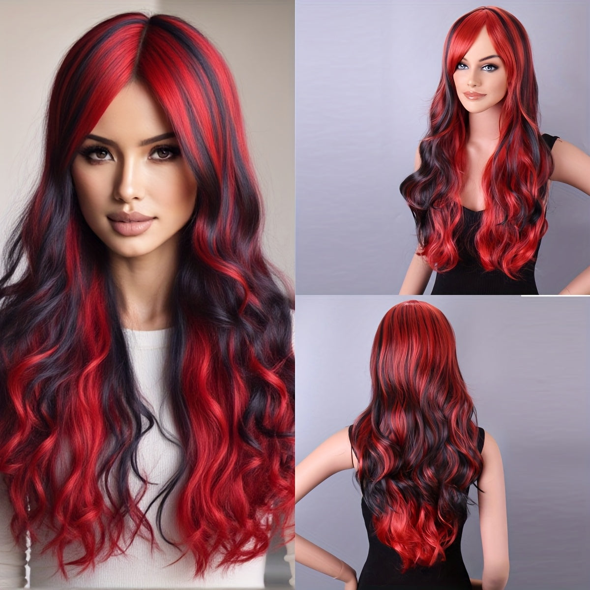 A 26-inch Red and Black Gradient Wig with Bangs is Suitable for Party Styling Wigs for Women