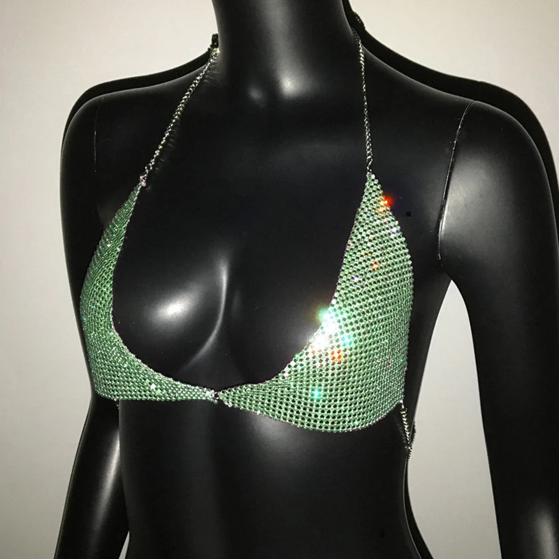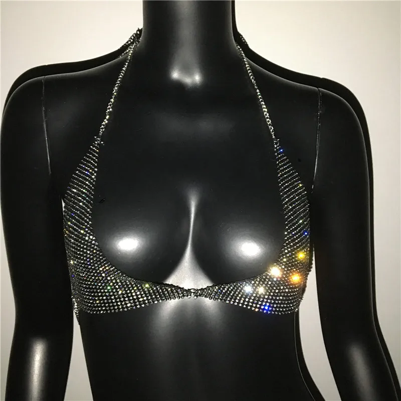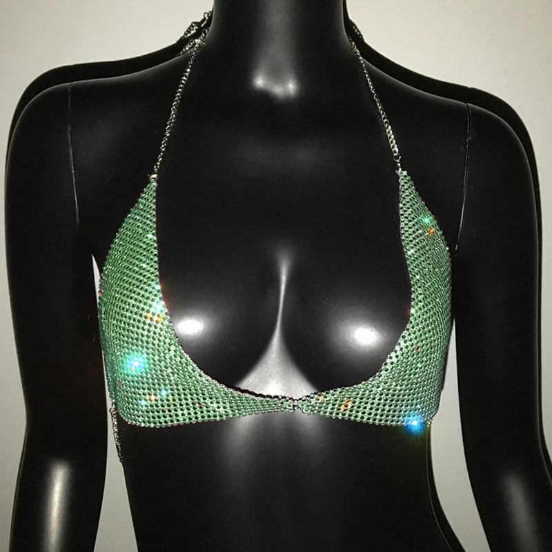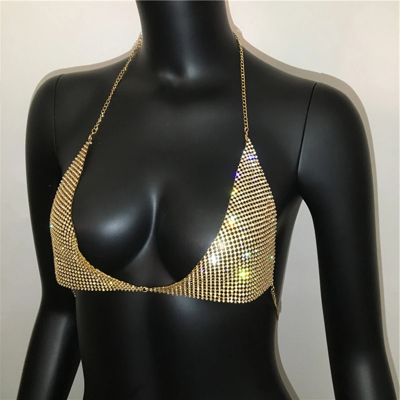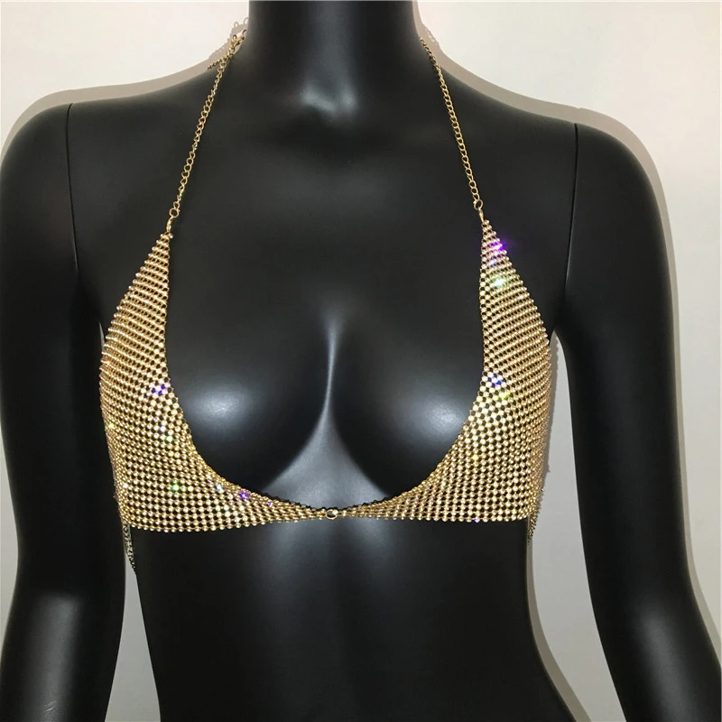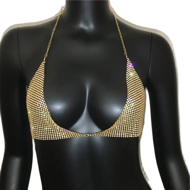 AKYZO Women Halter Handmade Rhinestones Bling Tank Tops Shiny Beach Bralette Party Club Gold Metal Diamond-Studded Camis