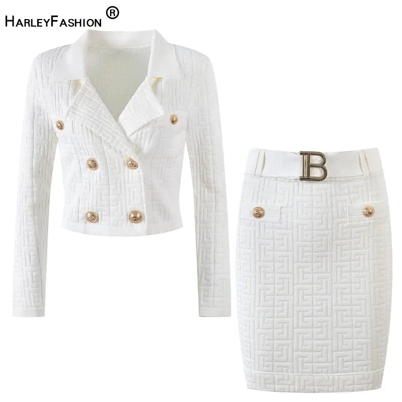 Brand Fall Women Stretch Knit Two Piece Sets Texture Pattern Long Sleeve Cardigan Sweater Tops Slim Skirt Belt 2 Color Option OL