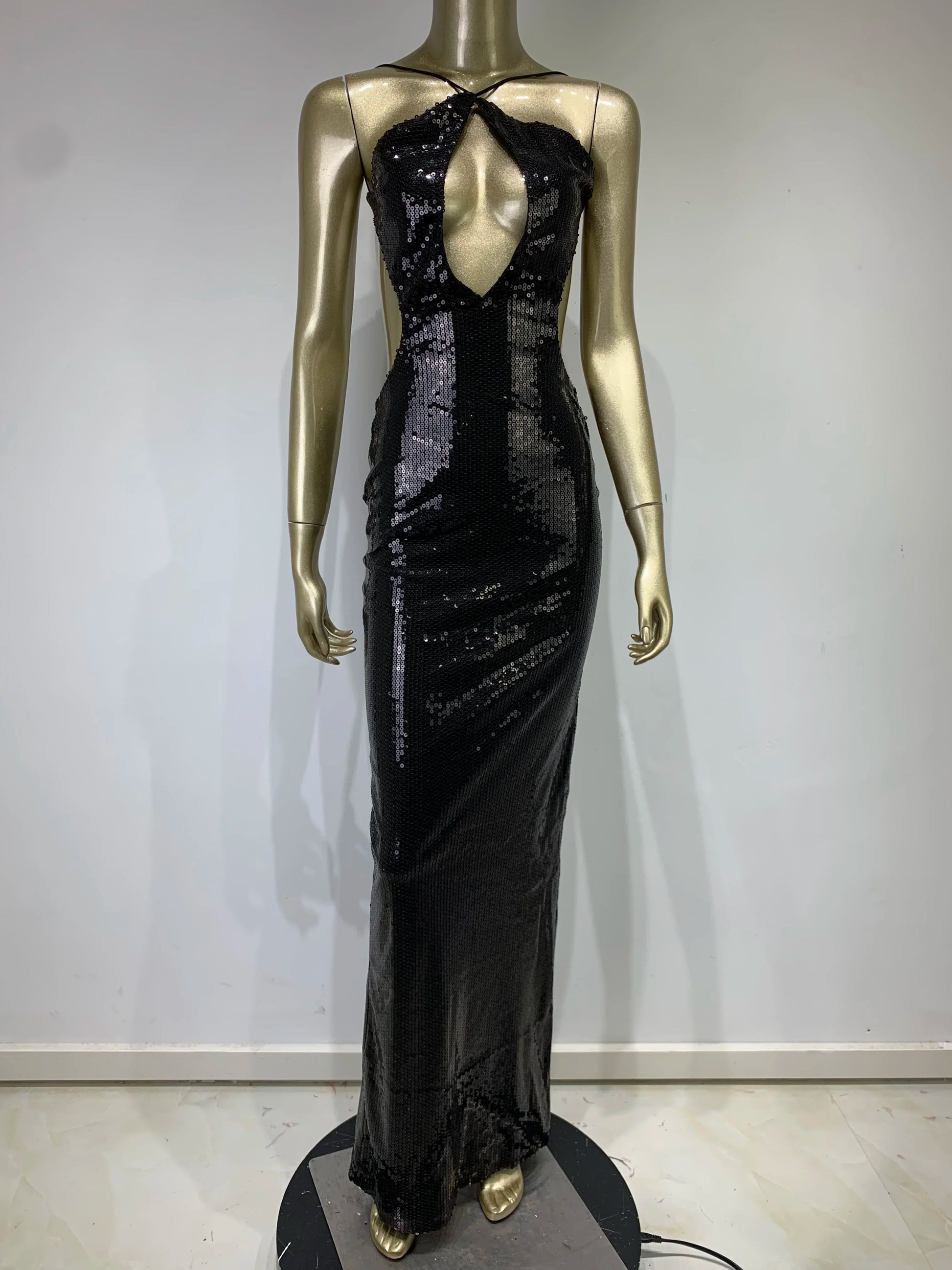 BRAND NEW UK Size Sexy Luxury Black Silk Maxi Dress Women Spring Summer Backless Halter Mesh Sequins Long Silk Gowns Dress Red Carpet Celebrity Wedding Guest Evening Party Club Dress