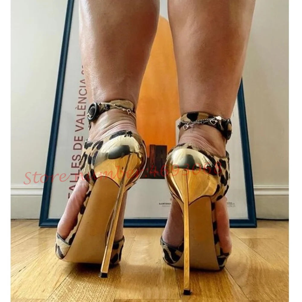 Brown Leopard Metal Stiletto Sandals Women Sexy Suede High Heels Party Peep Toe Pumps Female Shoes Ankle Wrap Large Size Shoes