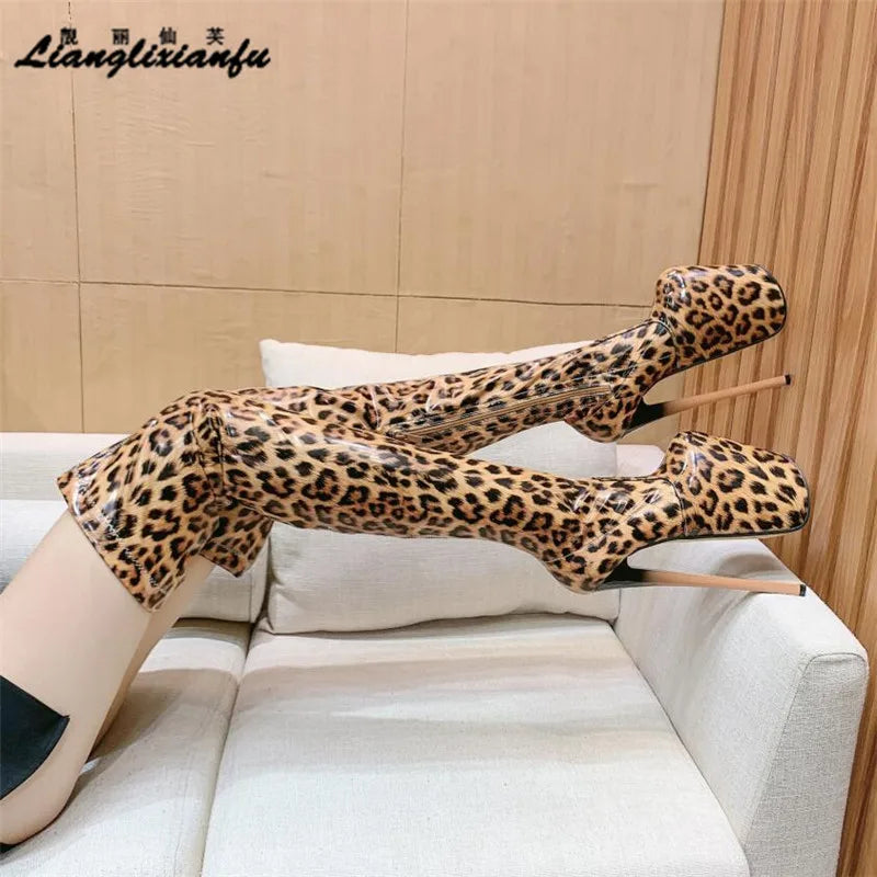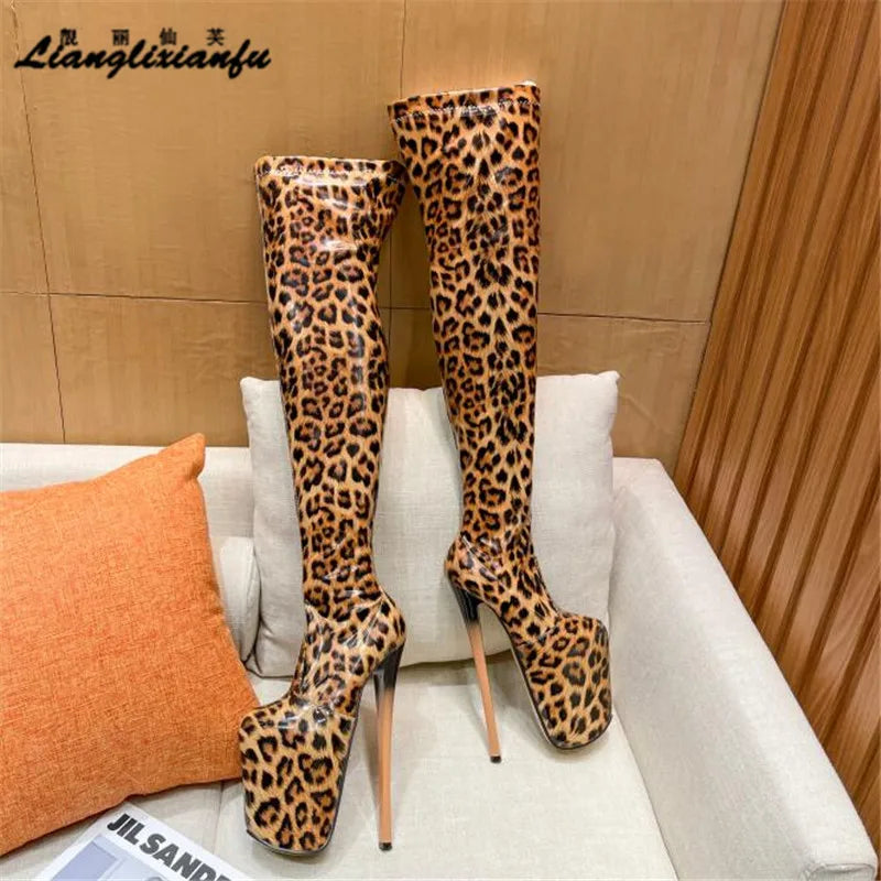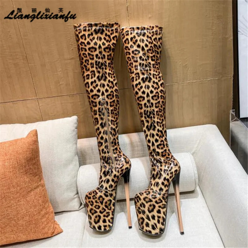 Corssdresser Leopard print Motorcycle botas mujer over-the-knee long Boots Platform Shoes Woman 20cm Thin Heels Party 22cm Pumps