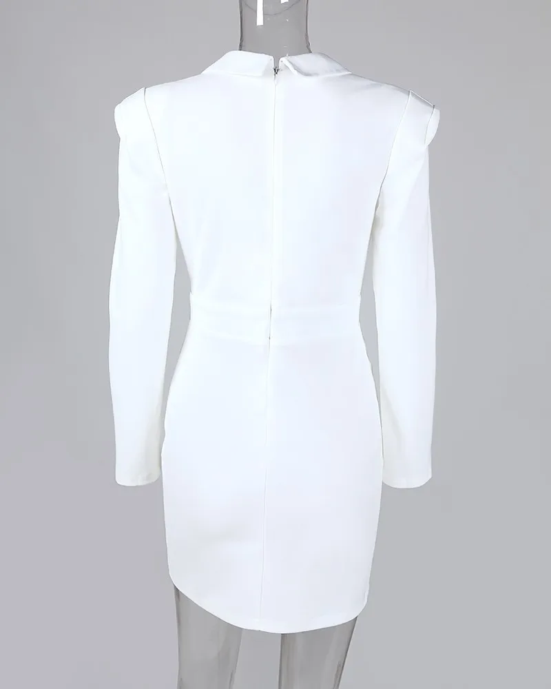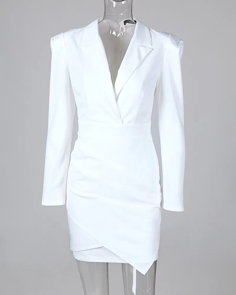 Elegant Notched Collar Padded Shoulder Ruched Blazer Dress Long Sleeve White Dress Office Workwear Blazer Vestidos