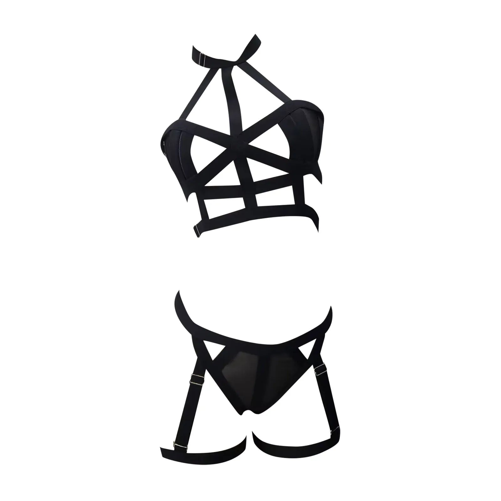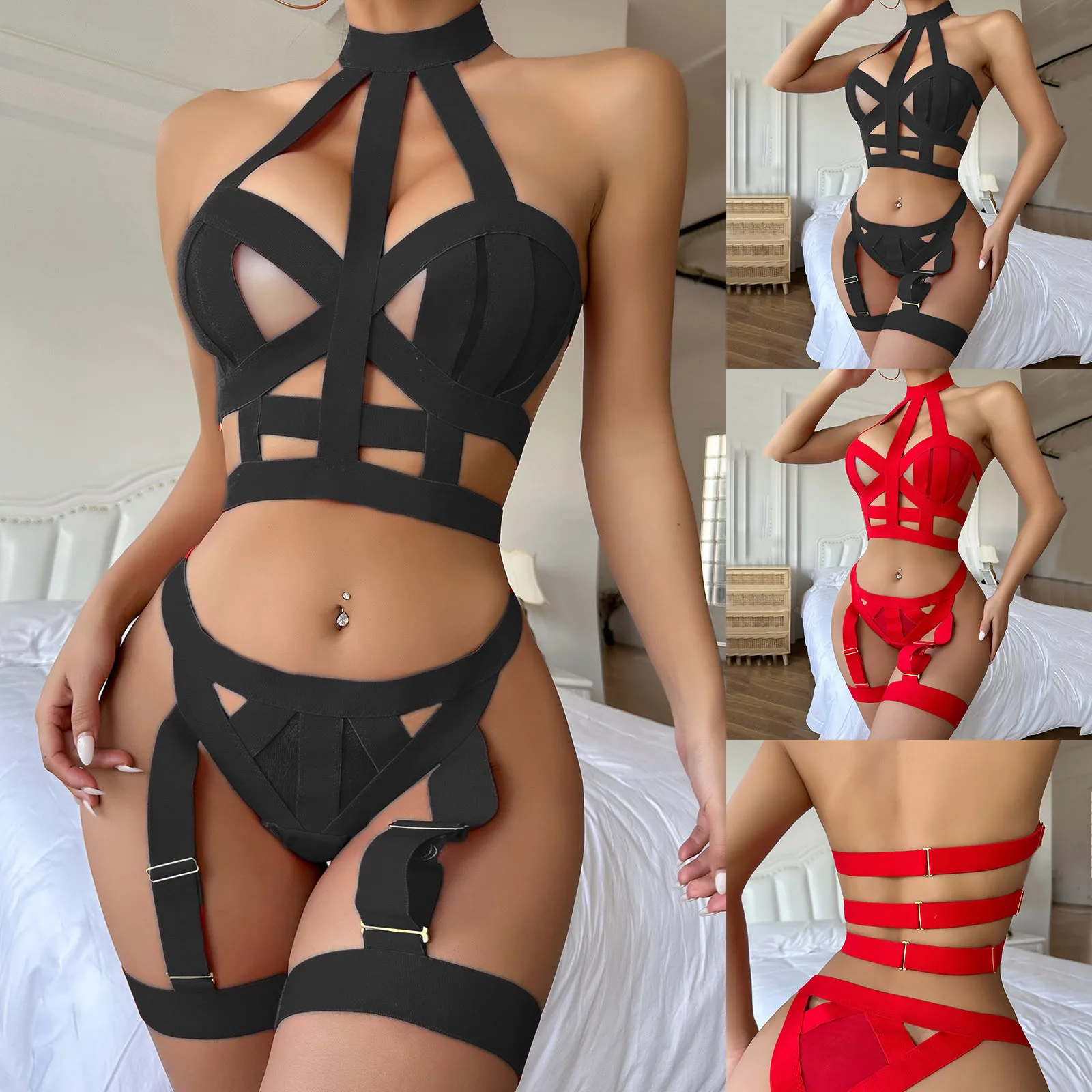 Erotic Lingerie Bandage Underwear Halter Bra Kit Push Up Sexy Outfits Sissy Open Cup Bra Solid Hot Red Fine Intimate Set