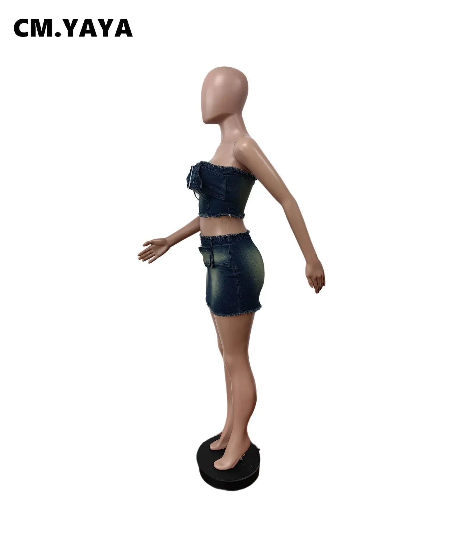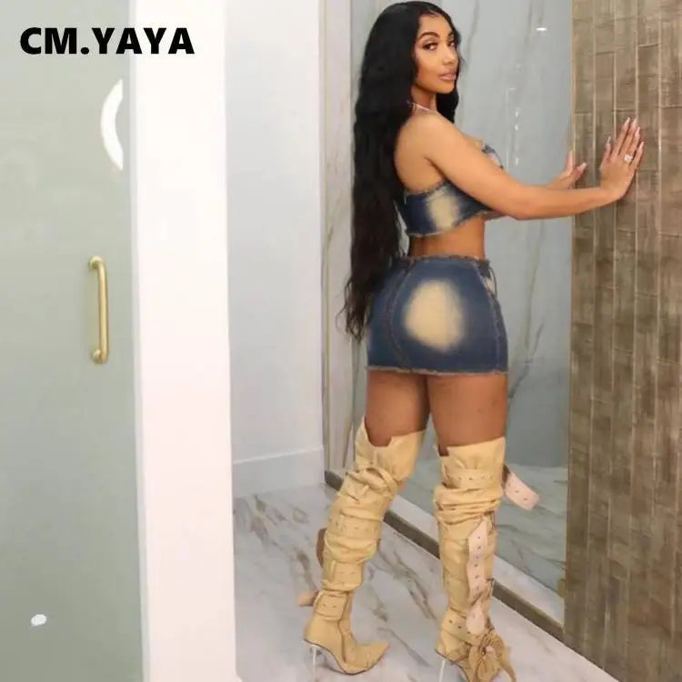 Fashion Denim Women's Set Strapless Crop Top and Mini Bodycon Midi Skirt Streetwear Chic Two 2 Piece Set Outfits