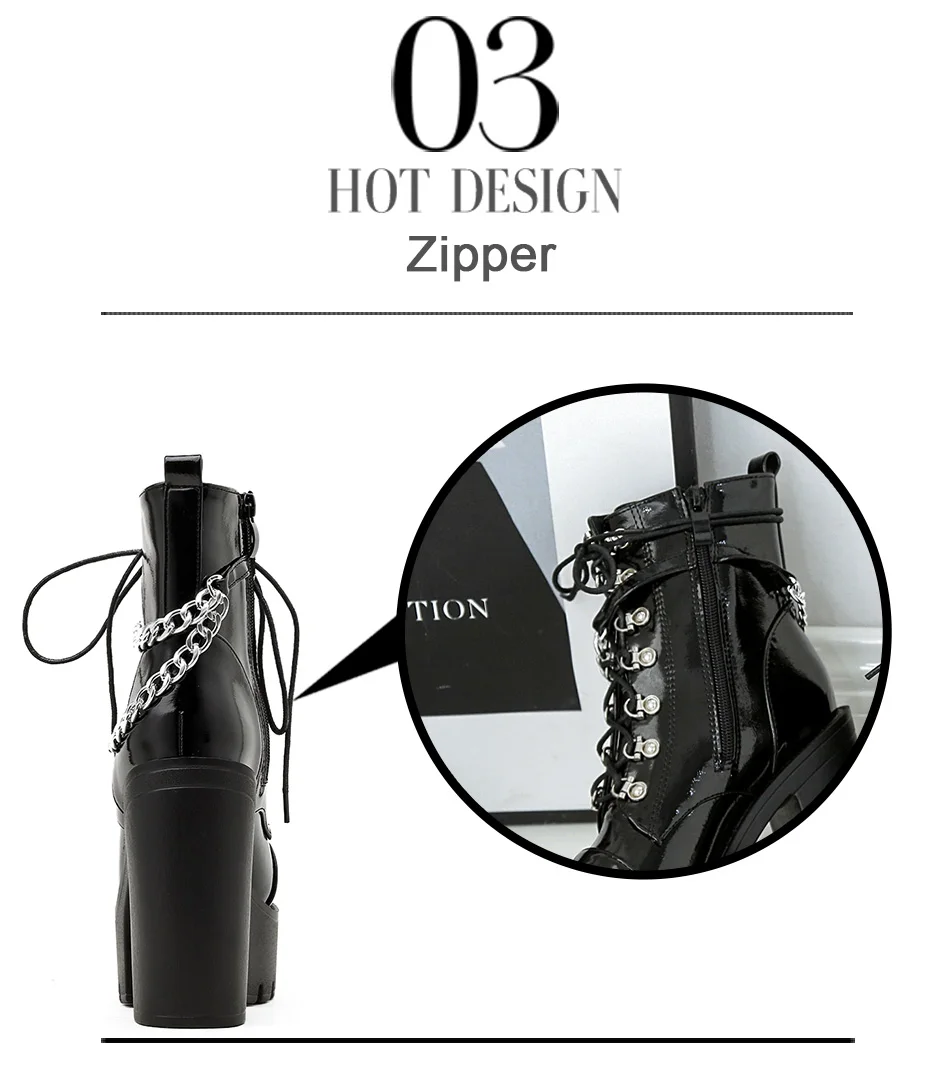 Gdgydh Women's Black Gothic High Heel Ankle Boots Sexy Chain Punk Style Patent Leather Platform Boots Lace Up Motorcycle Boots