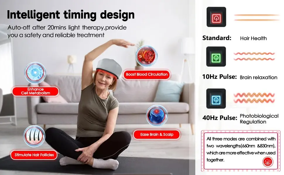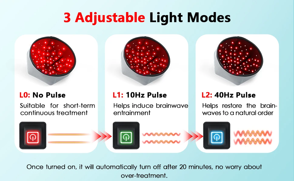 Features:1. Three pulse modes: 10HZ is a frequency that is beneficial to the human body, and 40HZ is a frequency close to the frequency of human brain waves. And Pulse Modes , can go deep into the skin and can better allow the skin to absorb the energy brought by red light therapy to avoid scalp burns by continuous use. It can affect the entrainment of human brain waves through frequency pulses, thereby improving the effect of treating brain diseases.2. Convex optical design: