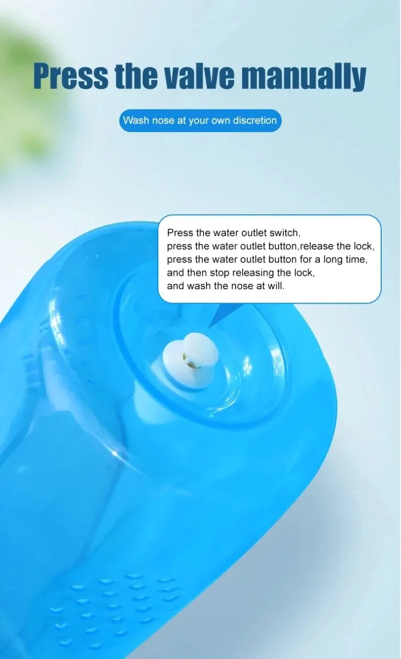 4. Postura correcta: Mantenga la parte superior del cuerpo inclinada hacia adelante, mirando hacia abajo, y con la cabeza ligeramente inclinada sin lado, sostenga la botella boca abajo e inserte suavemente la punta en una fosa nasal. Relájese, abra la boca ligeramente y respire (por la boca). NO contenga la respiración, NO respire por la nariz. Presione el botón de la válvula en la parte inferior de la botella de agua (Figura 1) y la solución fluirá automáticamente. NO apriete la botella de agua. La solución de enjuague entrará en la fosa nasal y bañará la nariz y los senos nasales y saldrá por la otra fosa nasal. Al terminar de lavar una fosa nasal, suelte el botón para detener la solución. Gire para lavar ambas fosas nasales.