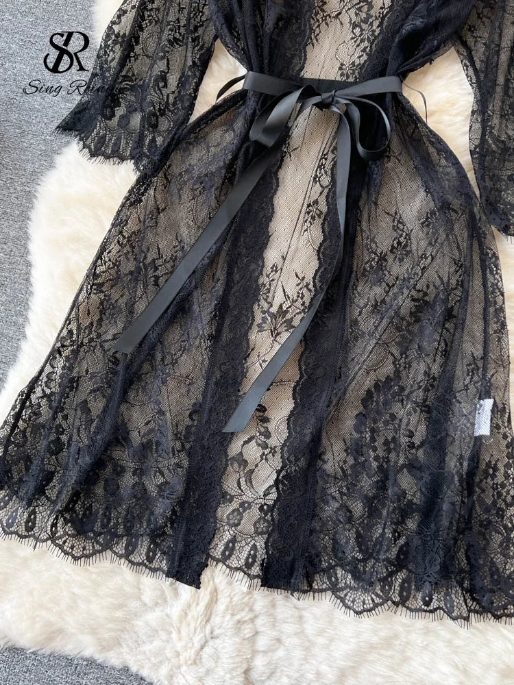 Mesh Sheer Sensual Cardigan Nightwear Women V Neck Lace Print Night Dress Summer Long Sleeve Lingerie Erotic Pajamas