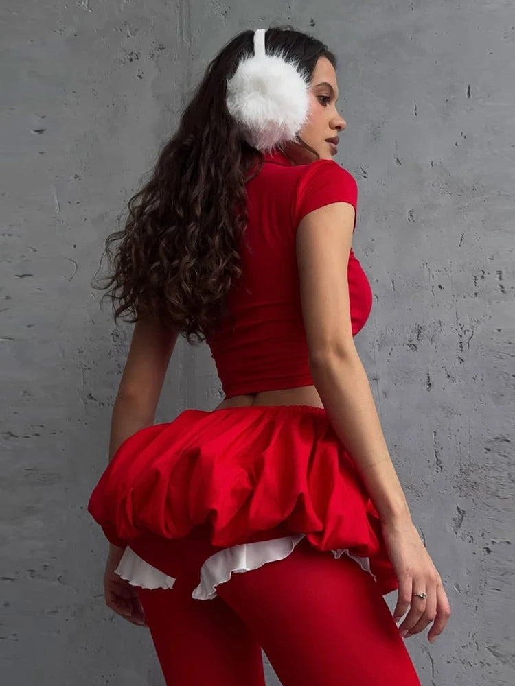 NEW 2PCS Set Black/Red Color Hottie Casual Set Women Mini Skirts Shorts Sleeve Crop Tops +Puffy Skirt Simple Basic Matching Streetwear Outfits