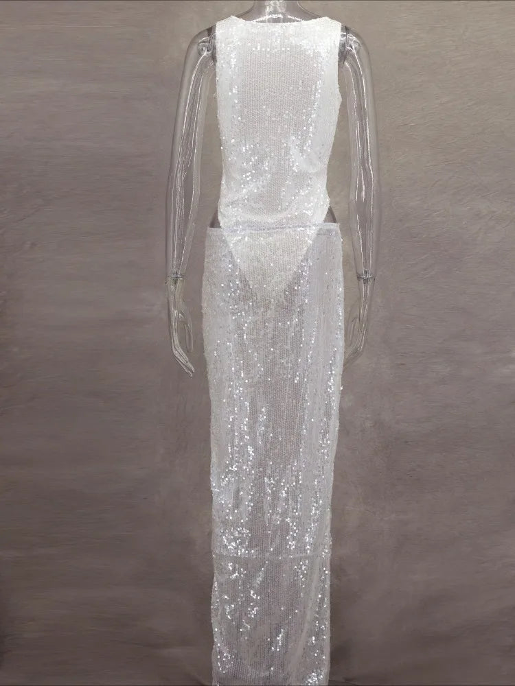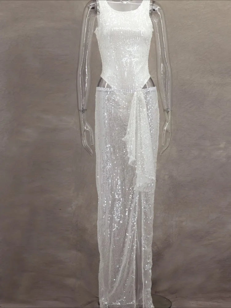NEW Arrivals 2PCS Set UK Size Luxury Glitter Elegant Sequined Ribbon Skirts Women Holidays Party Suits Sexy Bodysuit and Slit Long Skirts Ladies Evening Beach Party Night Club Dress Sets