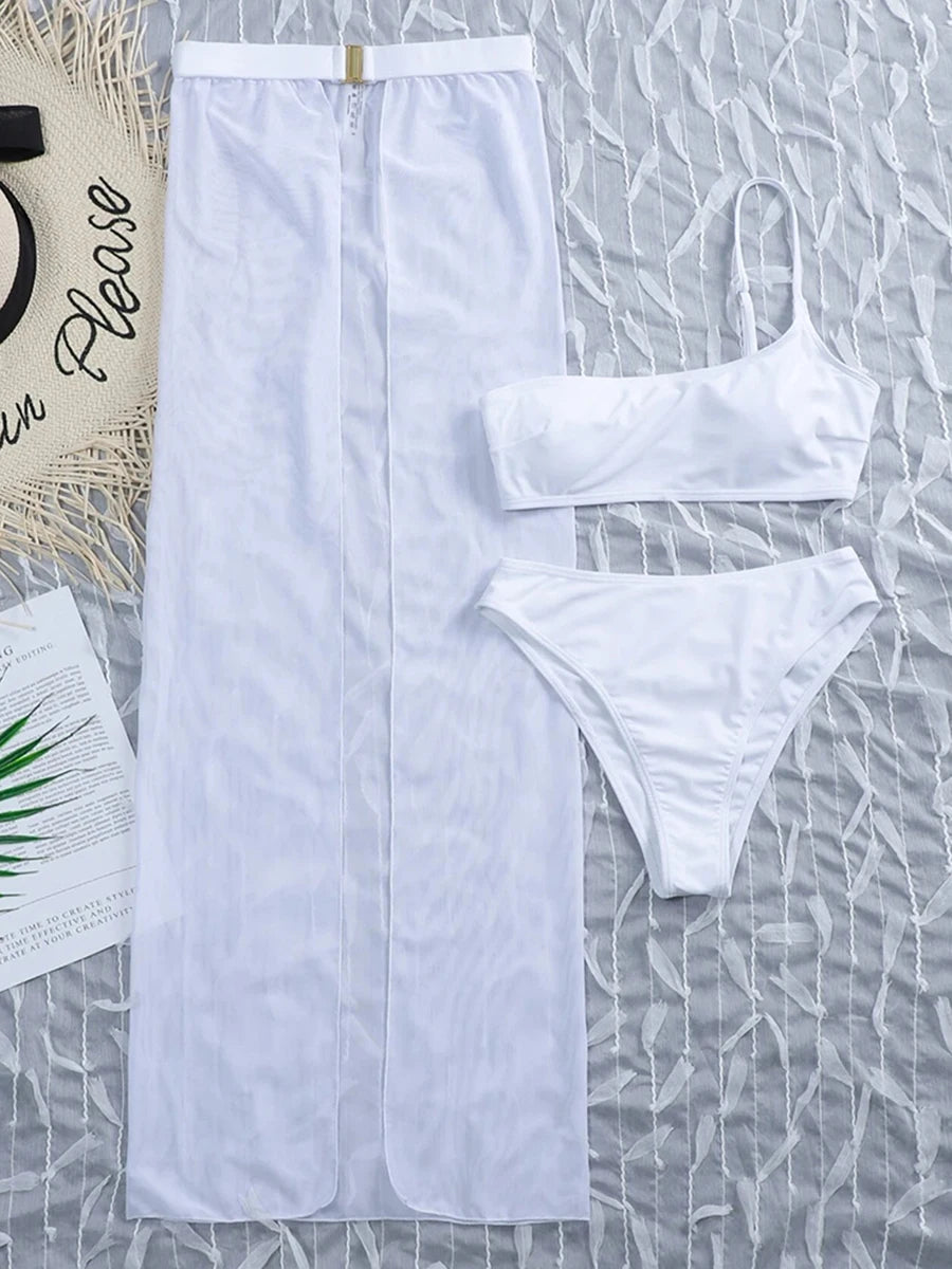 NEW Arrivals 3PCS Set White/Red/Black One Shoulder Bikini 2025 Women & Beach Skirt Swimwear Female Sexy Swimsuit Solid Beachwear Bathing Swimming Girls Ladies Sexy Beach Wear Suit