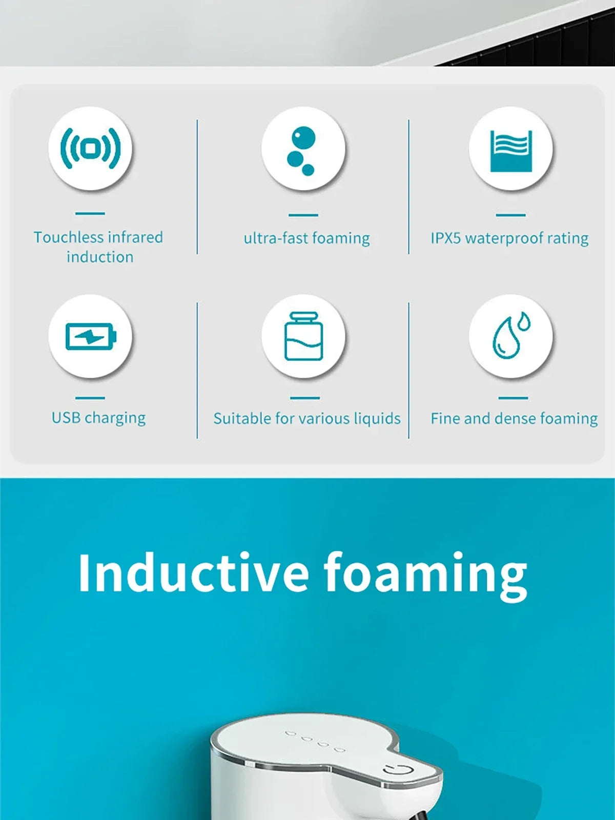 NEW Arrivals Automatic Black/White Soap + Fluids Dispenser Touchless Foaming Soap Dispenser 350ml USB Rechargeable Electric 4 Level Adjustable Foam Soap Dispenser Home Bathroom Kitchen Accessories