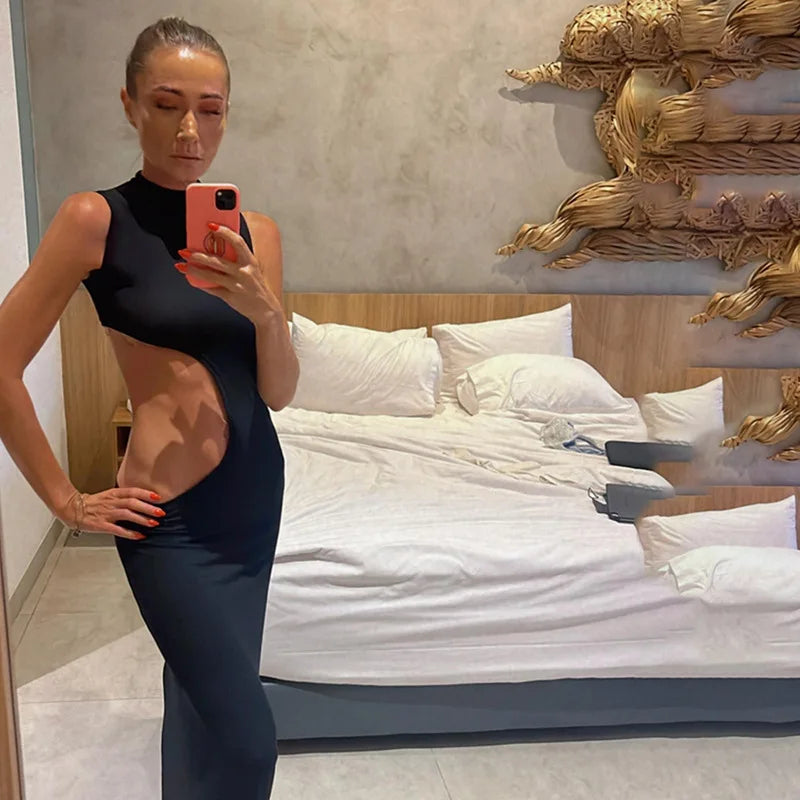 NEW Arrivals Black Cryptographic Sexy Cut Out Maxi Dress Outfits for Women Elegant Club Party Bodycon Sleeveless Tank Dresses Summer Beach Bar Party Night Clubwear