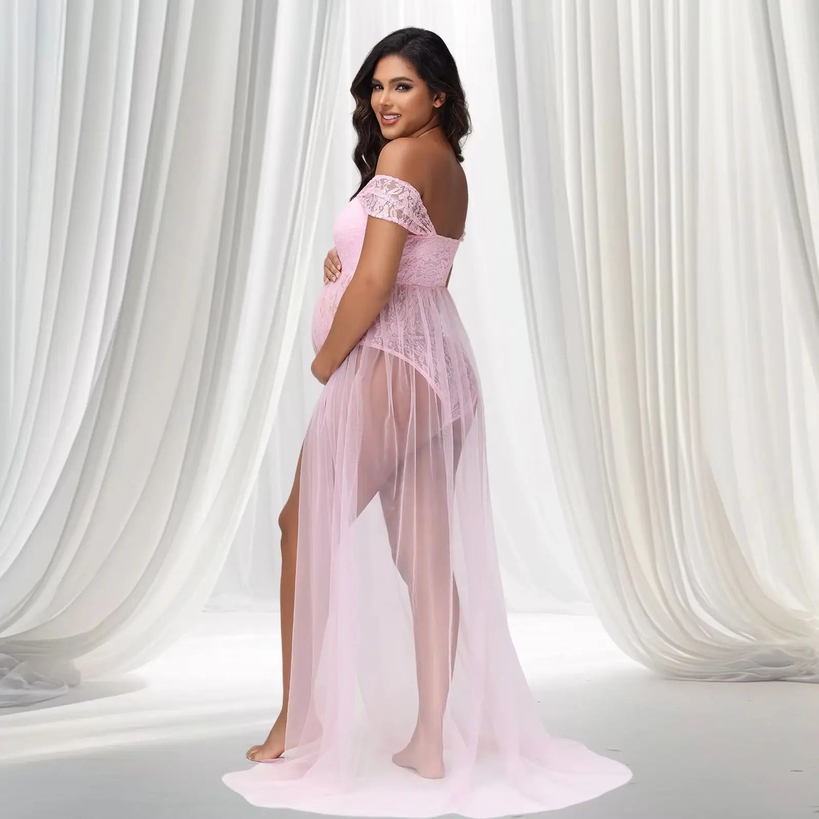 NEW Arrivals Maternity Lace Off-Shoulder Bodysuit for Photoshoot with Tulle Long Sides Slit Tail Women