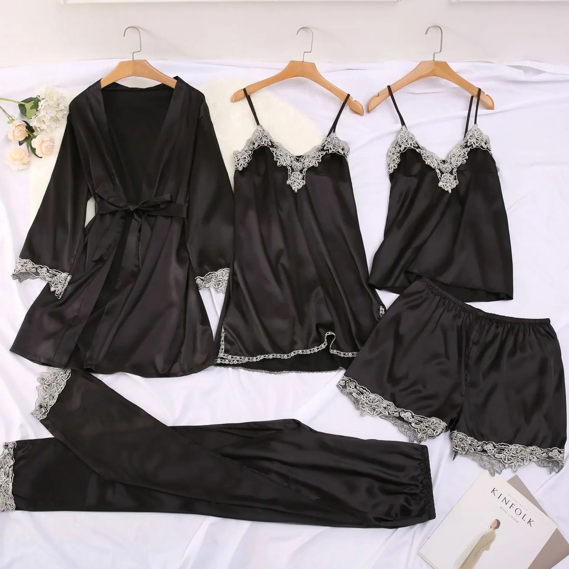 NEW Arrivals S-3XL Plus Size 5PCS Set 4 Colors Silk Feel Luxury Pajamas Set Chubby Women's Nightgown Lingerie Sleepwear V Neck Home Clothes Fun Adult Toys And Games Ladies Sleepwear Sets