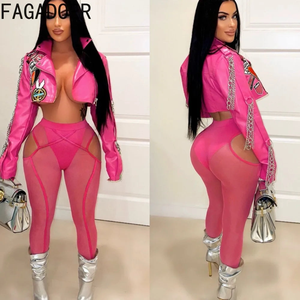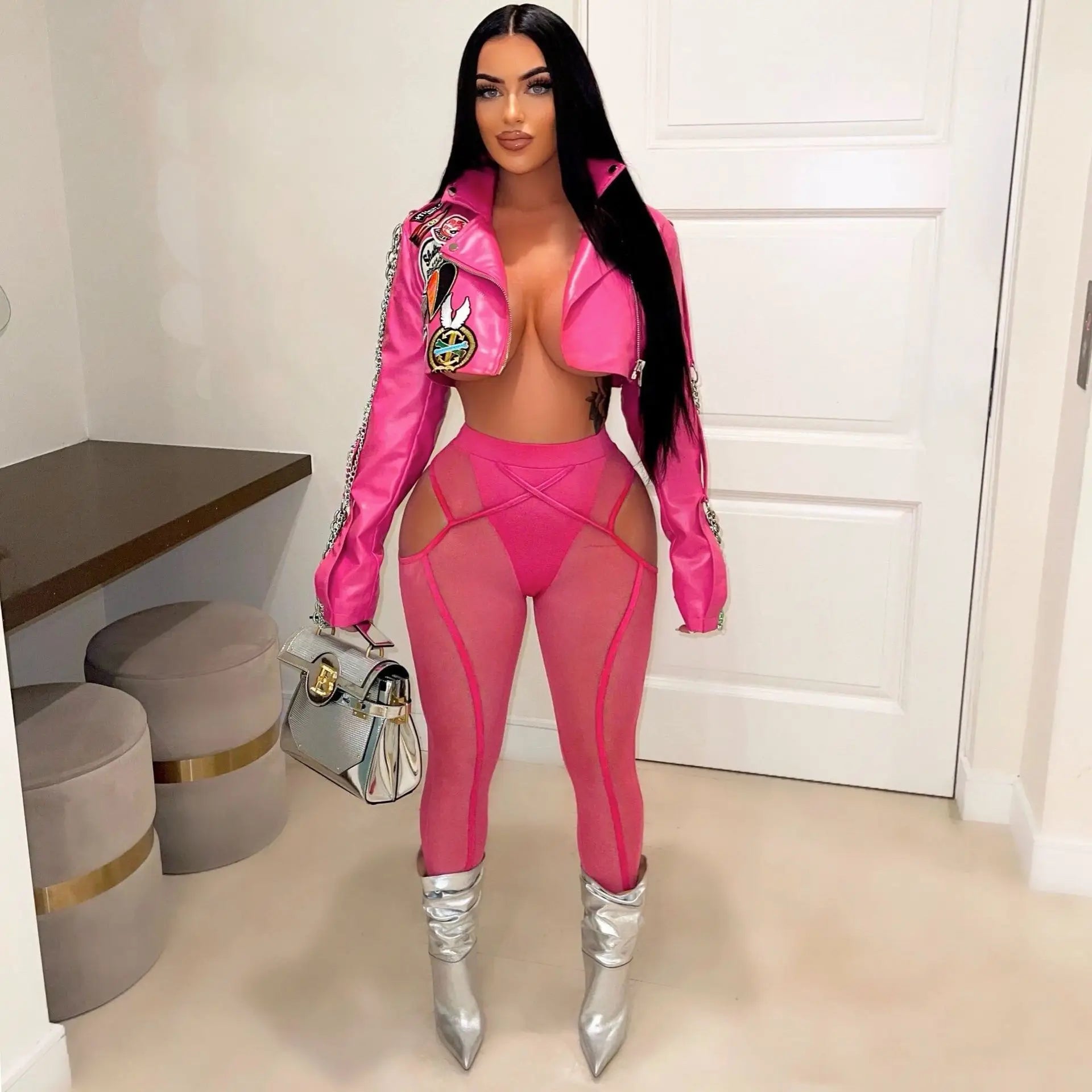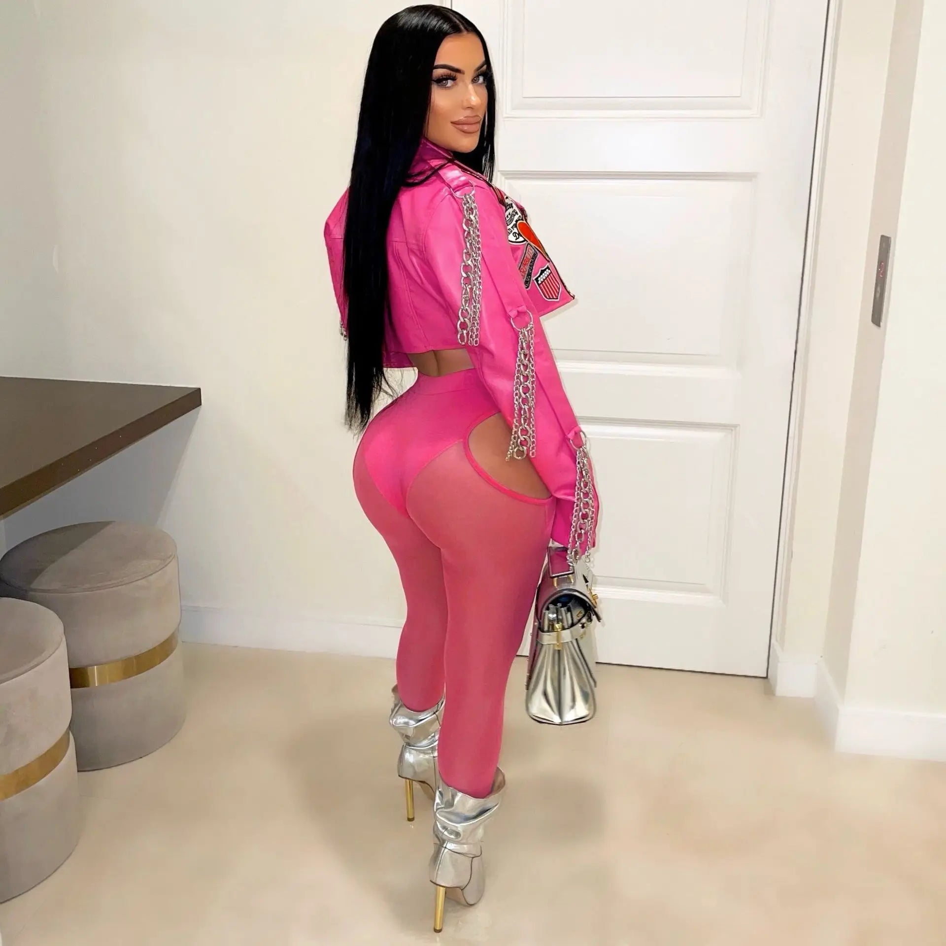 NEW Arrivals Y2K Rose Pink Leather Jacket Women Punk Moto Coat Lapel Chain Patchwork Cropped Jackets Hot Girl Autumn Winter Outwear