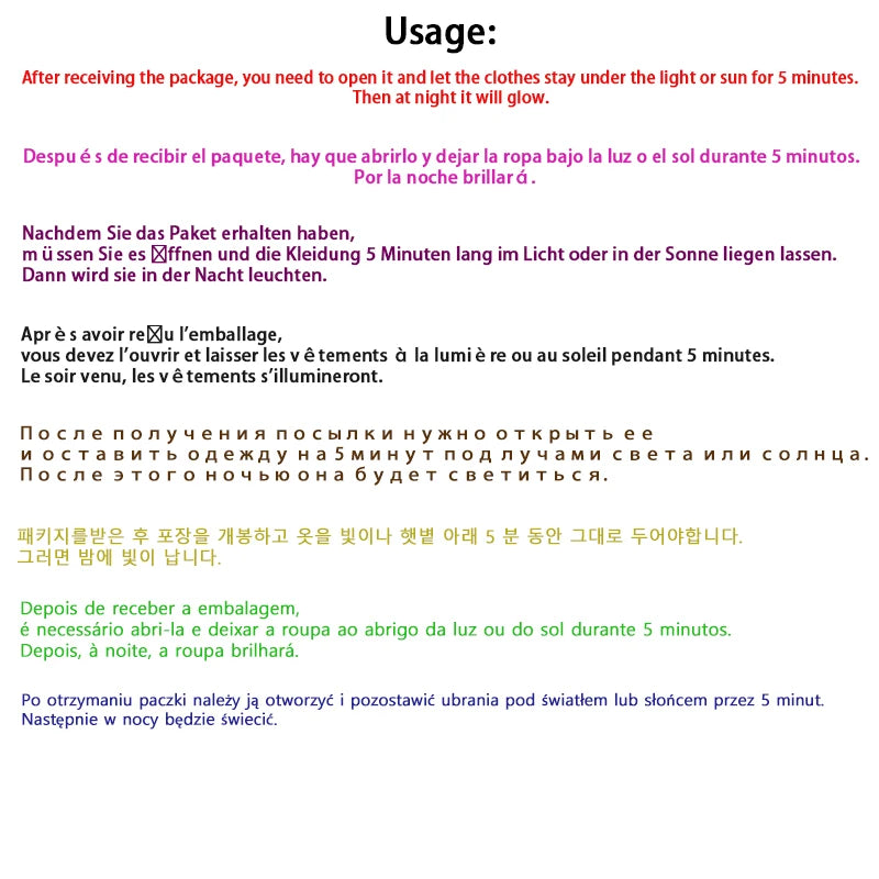After receiving the package, you need to open it and let the clothes stay under the light or sun for 5 minutes. Then at night it will glow.