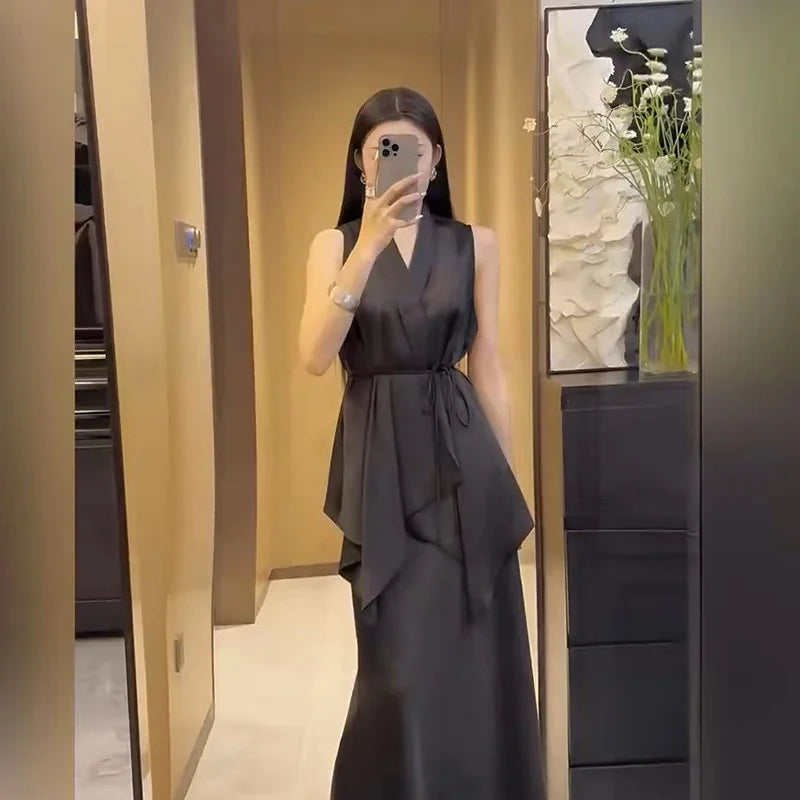 NEW S-3XL Plus Size 4 Colors Temperament Satin Sleeveless Tank Top Top Tee Summer Fashion Lacing Pleated Mid Length Top Ladies Fashionable V-Neck Blouse Tops