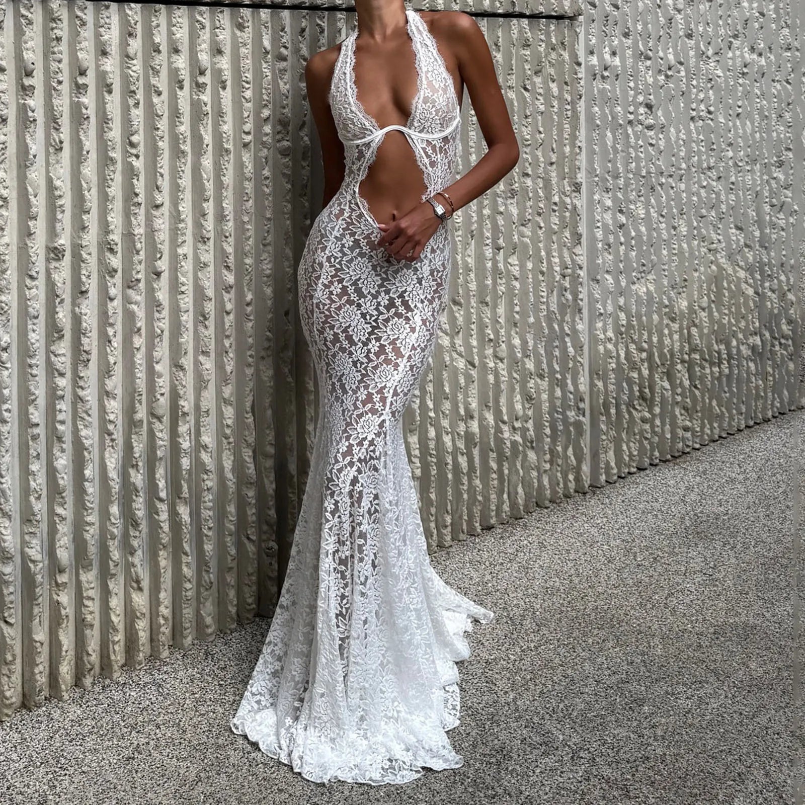 NEW Women's Handmade Sexy Lace Hollow Sexy Halter Dress Stylish Solid Mesh Lace Floral See Through Slim Fit Long Bodycon Fishtail Dress