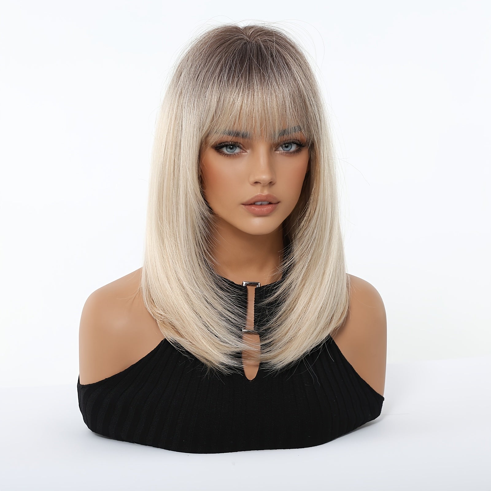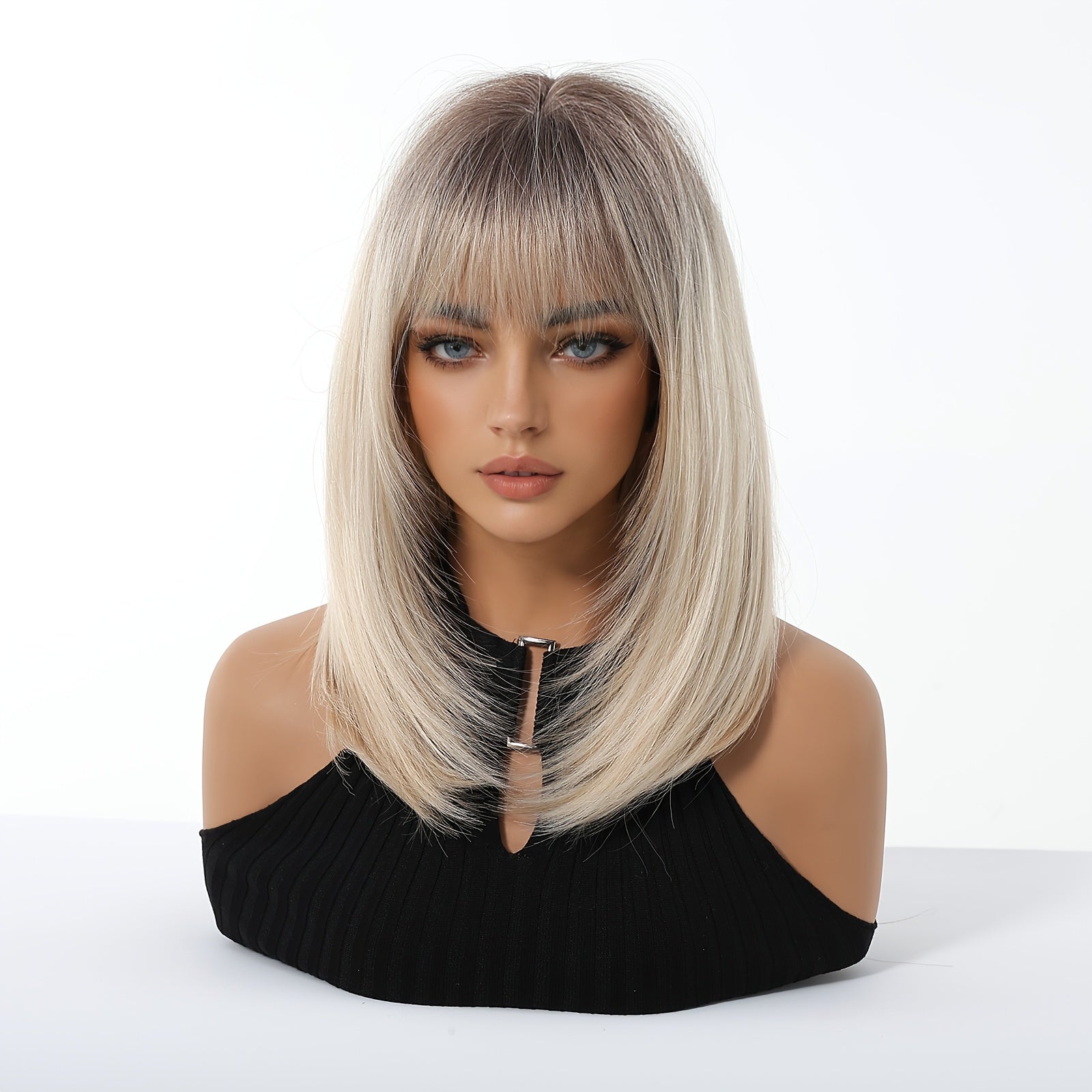 NEW Women's Short Straight Bob Wig with Bangs - White/Golden Dark Root Short Cut Synthetic Hair, Heat-Resistant Fiber Suitable for Daily Use, Parties, Photo Shoots - No Lace Front Women Hair Care Supplies
