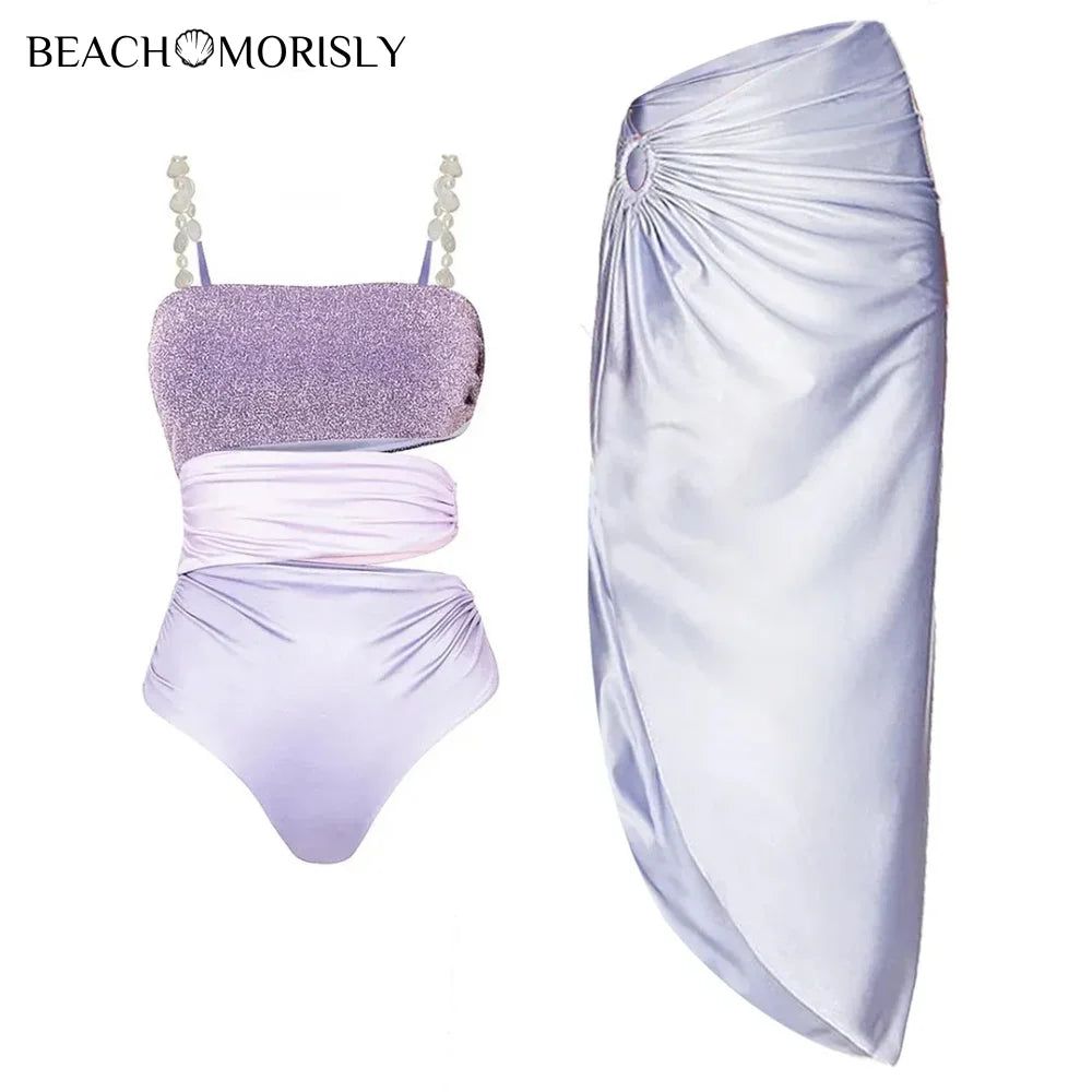 Pearl Shoulder Strap Cutout Shiny Texture One Piece Swimsuit and Skirt Swimwear Women Beachwear Bathing Suit bikini set