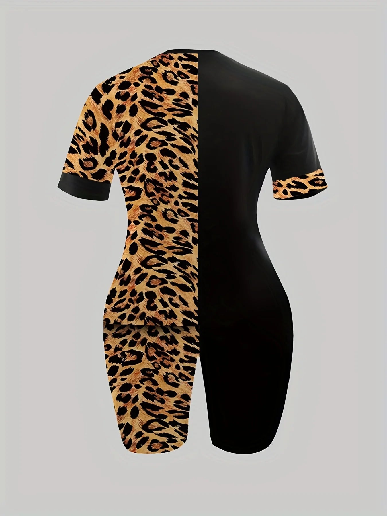 Plus Size Summer Fashion Outfits 2 Piece Set, Women's Leopard Print With Letter Print Short Sleeve Tee Shorts Leggings Clothing