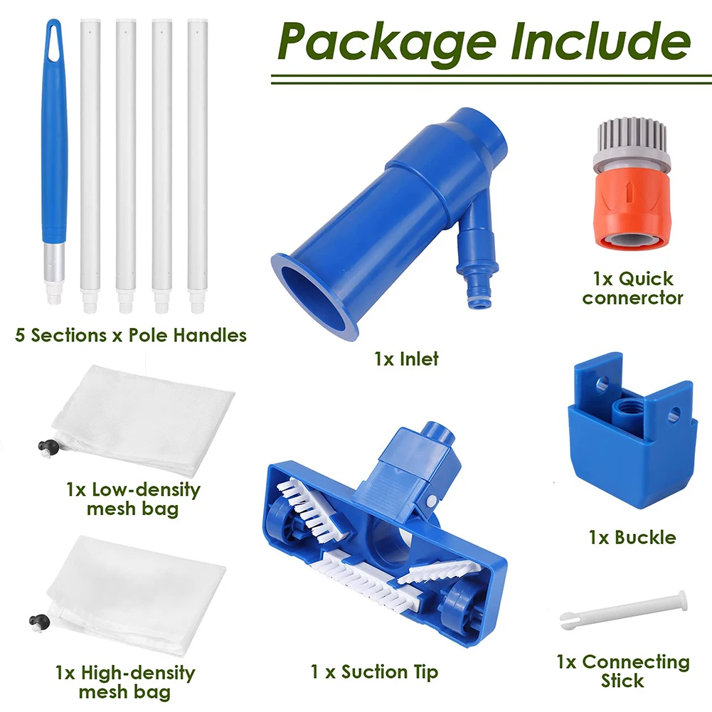 Feature: 1. This mini portable swimming pool vacuum cleaner can replace the expensive swimming pool vacuum cleaner without electrical components and batteries, which helps you save a lot of money. 2. This pool vacuum cleaner is powered only by the water pressure of the garden hose. The water in the hose enters a vacuum and produces a suction effect (the suction effect depends on the water pressure and the hose length). 3. The strong suction of the ejector makes cleaning easy. 4. Bring two net bags with low density, which are mainly used for larger things, such as leaves and insects. High density is mainly used for dirt, sand and other small things. 5. Easy installation, no filter system, interconnected components and no tools. 6. Equipped with an American standard quick connector, which can be easily connected to a 1.9 cm garden hose. 7. Two wheels can easily move the vacuum cleaner along the swimming pool floor. 8. Three brush heads can clean the bottom of the pool. 9. Five handle parts provide sufficient and comfortable length. 10. Small and light in size, suitable for swimming pools, swimming pools, ponds, fountains, hot springs or water facilities with a radius of 1.3m. Specification: Packing size: 30x27x5cm Packing: opp bag Plug: US Note: Due to the different monitor and light effect, the actual color of the item might be slightly different from the color showed on the pictures. Thank you! Please allow 1-2cm measuring deviation due to manual measurement.