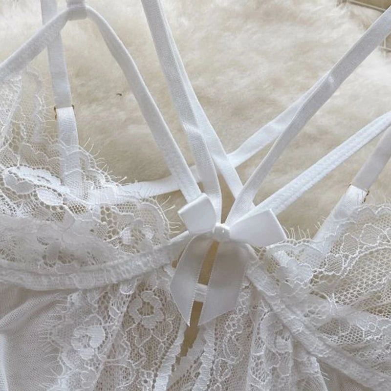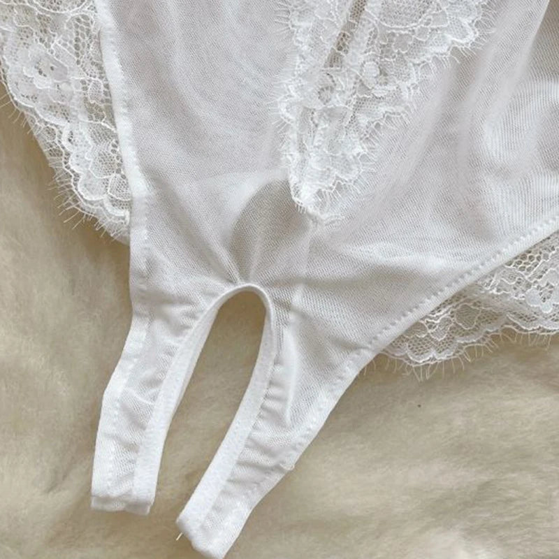 Sexy Hollow Out Strap Jumpsuit Hot Sweet Bow Lace Patchwork Backless Playsuit Slim Fit Bodysuit Erotic Lingerie Pajamas Woman