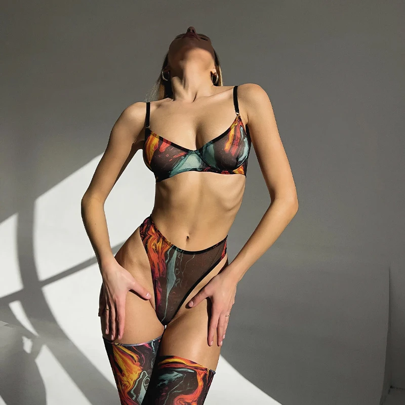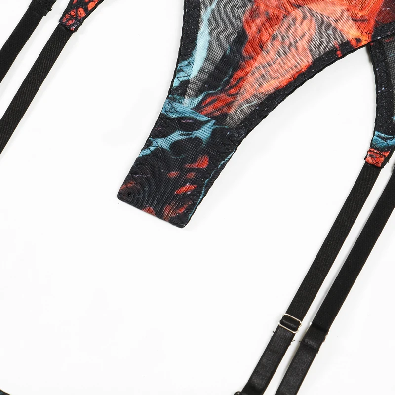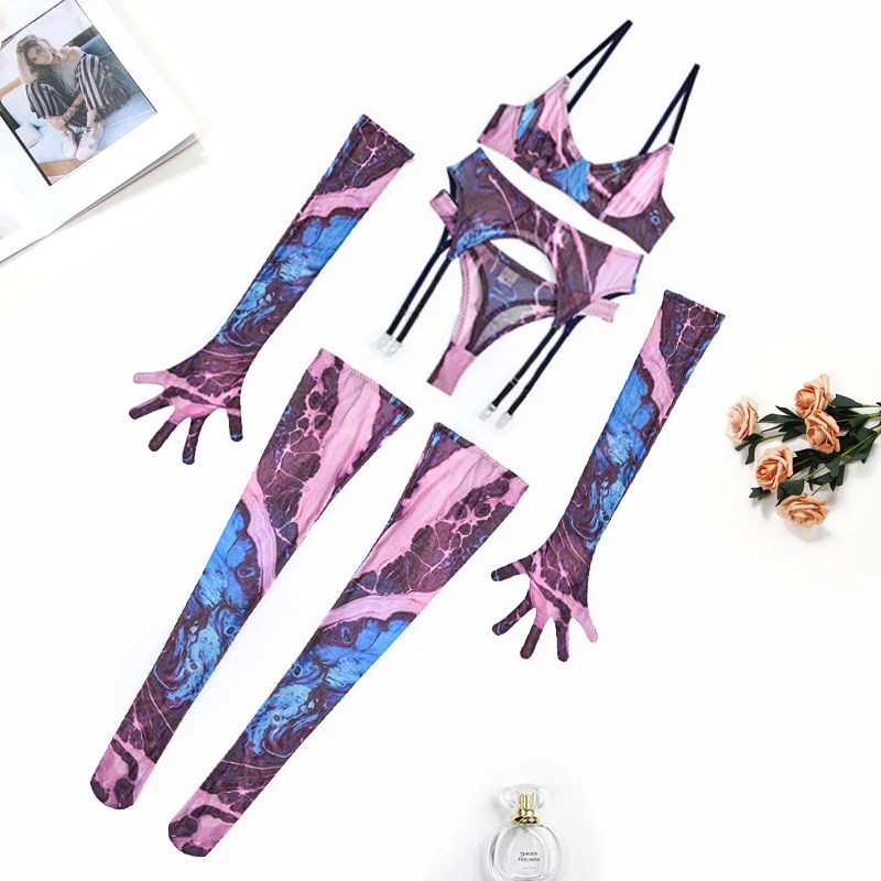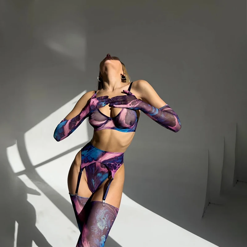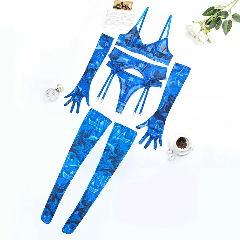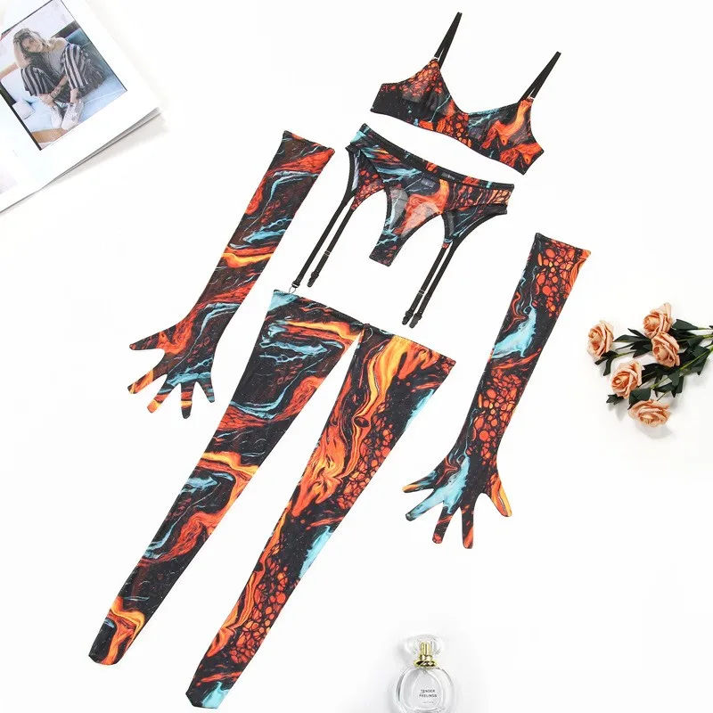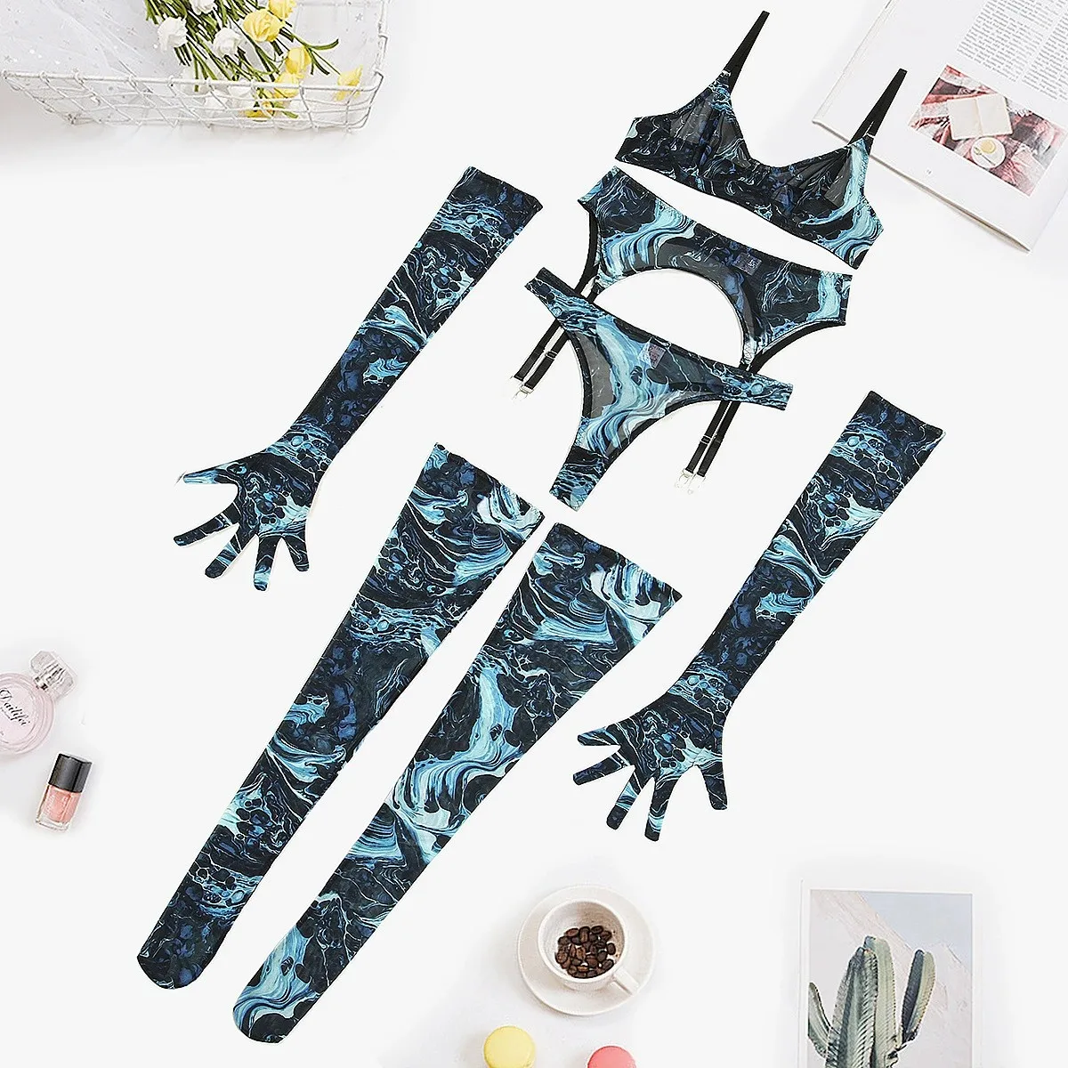 Summer Hot New Fashion Women's Bra Dazzle Colour Splash Ink 5 Pieces Set Mesh Gloves Garter Sexy Erotic Lingerie