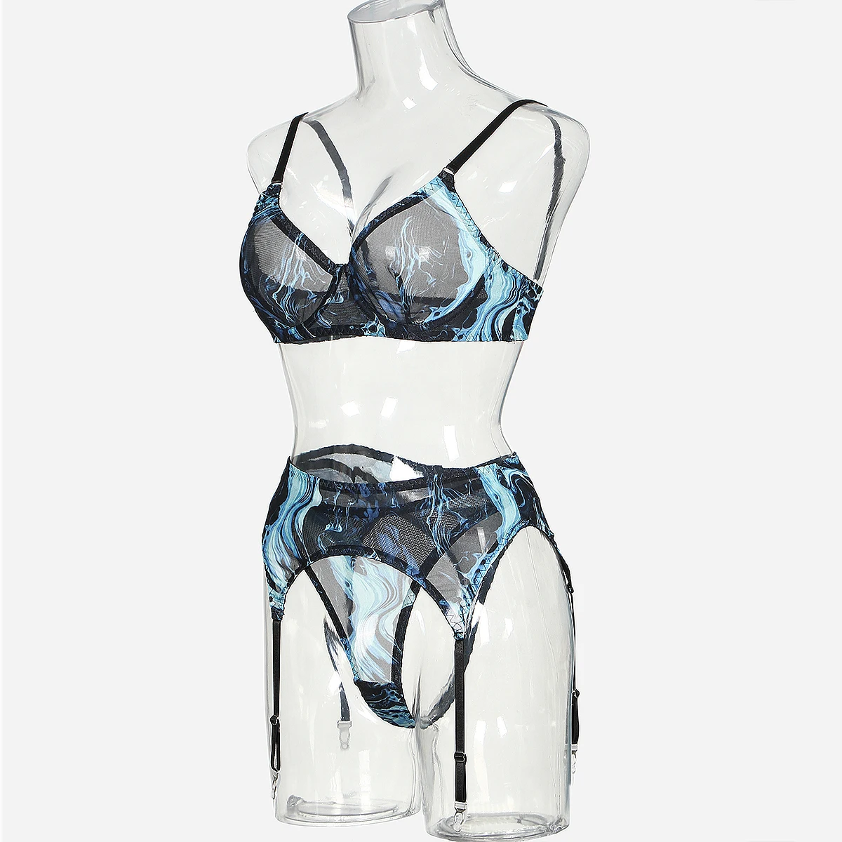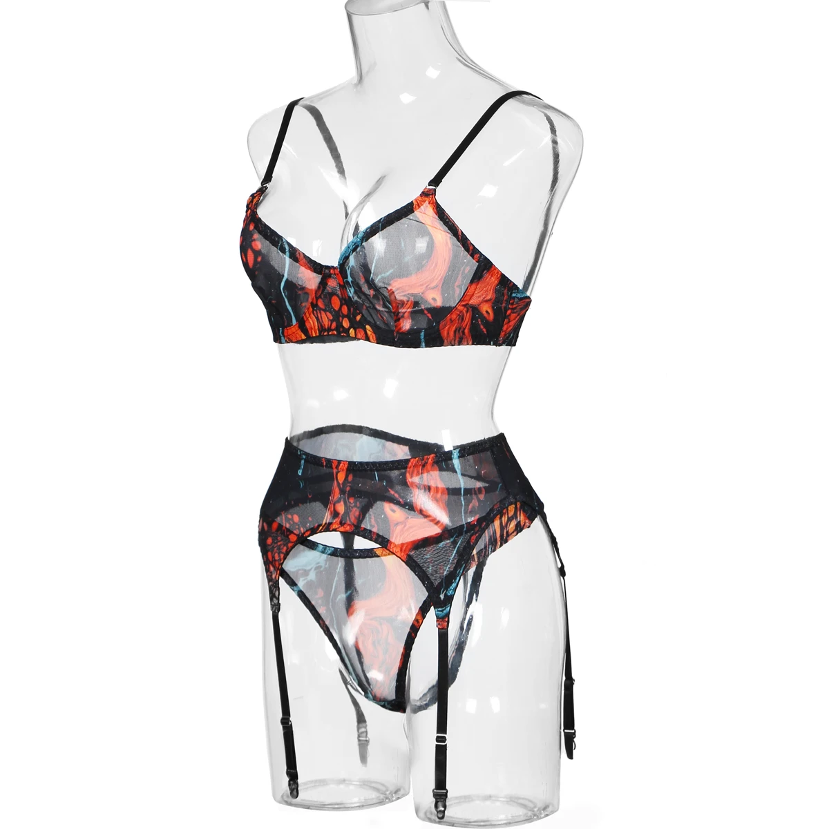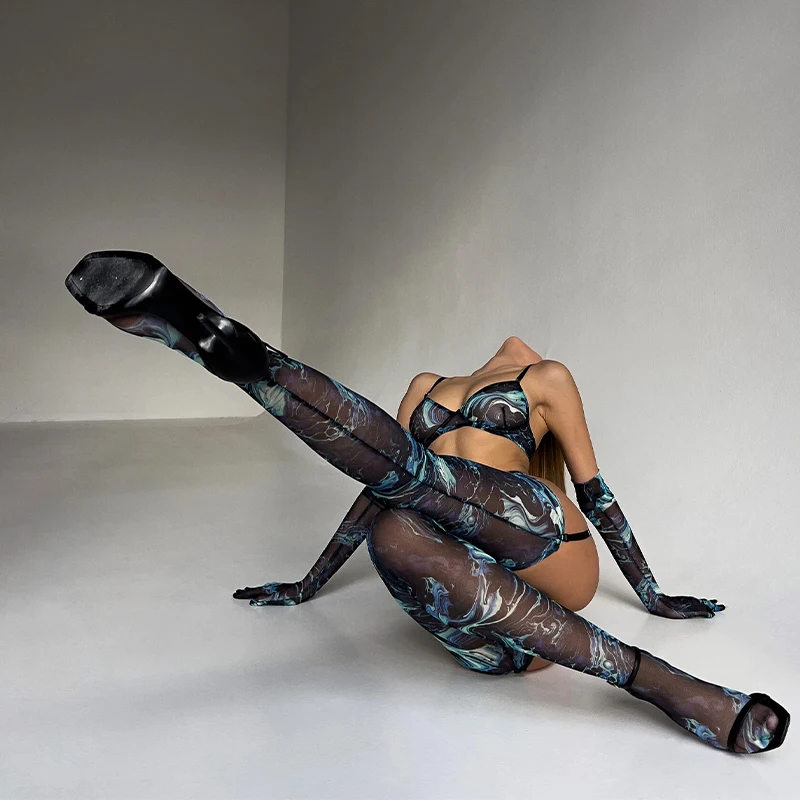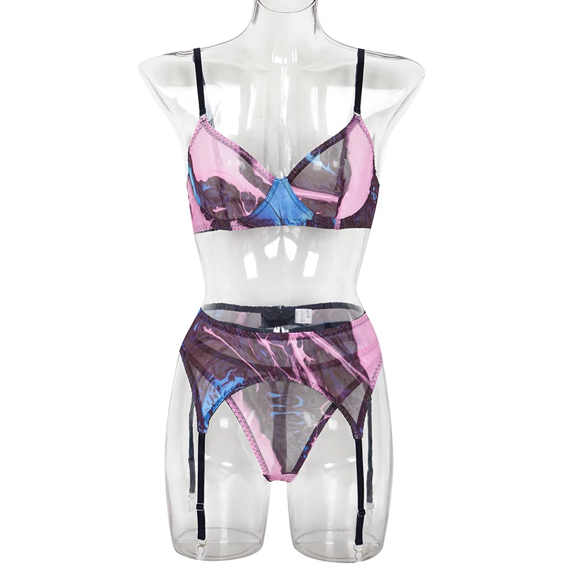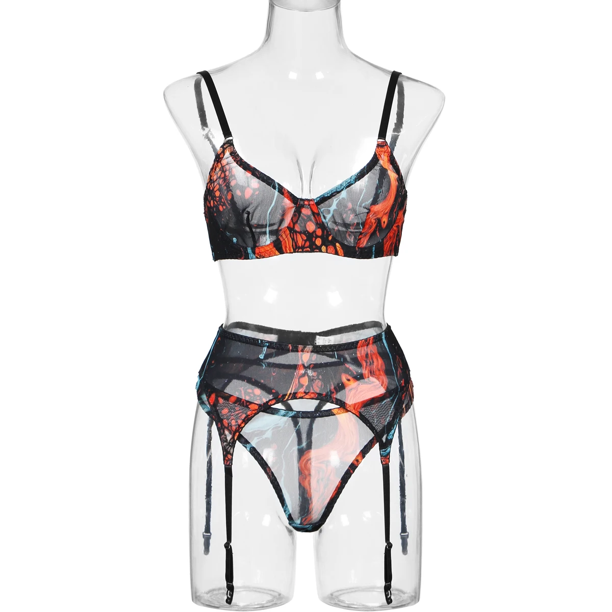 Summer Hot New Fashion Women's Bra Dazzle Colour Splash Ink 5 Pieces Set Mesh Gloves Garter Sexy Erotic Lingerie