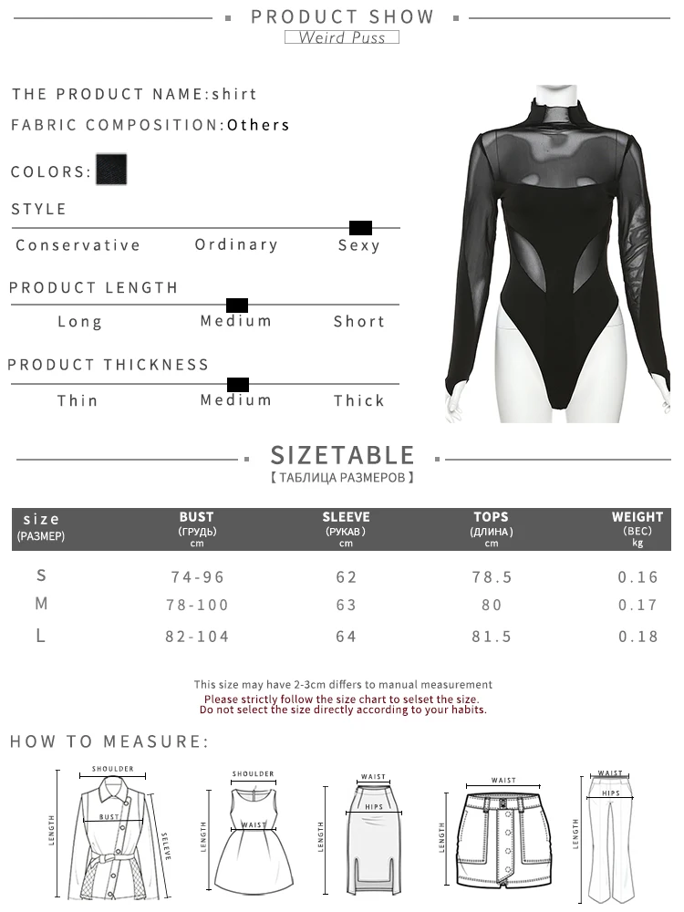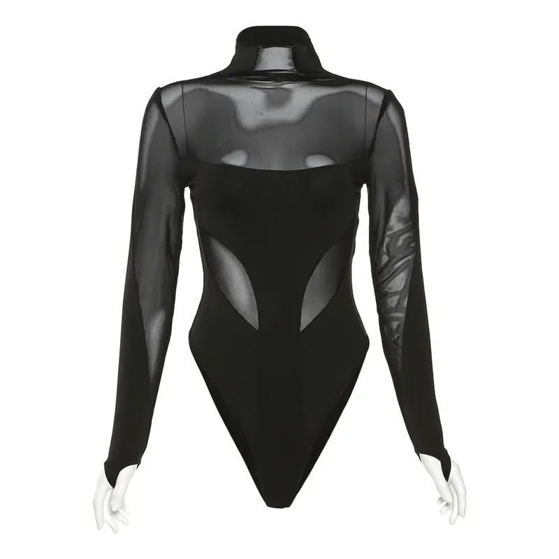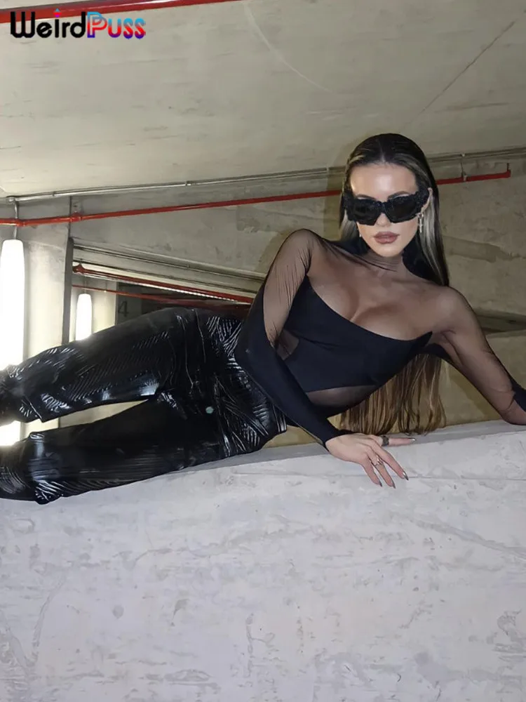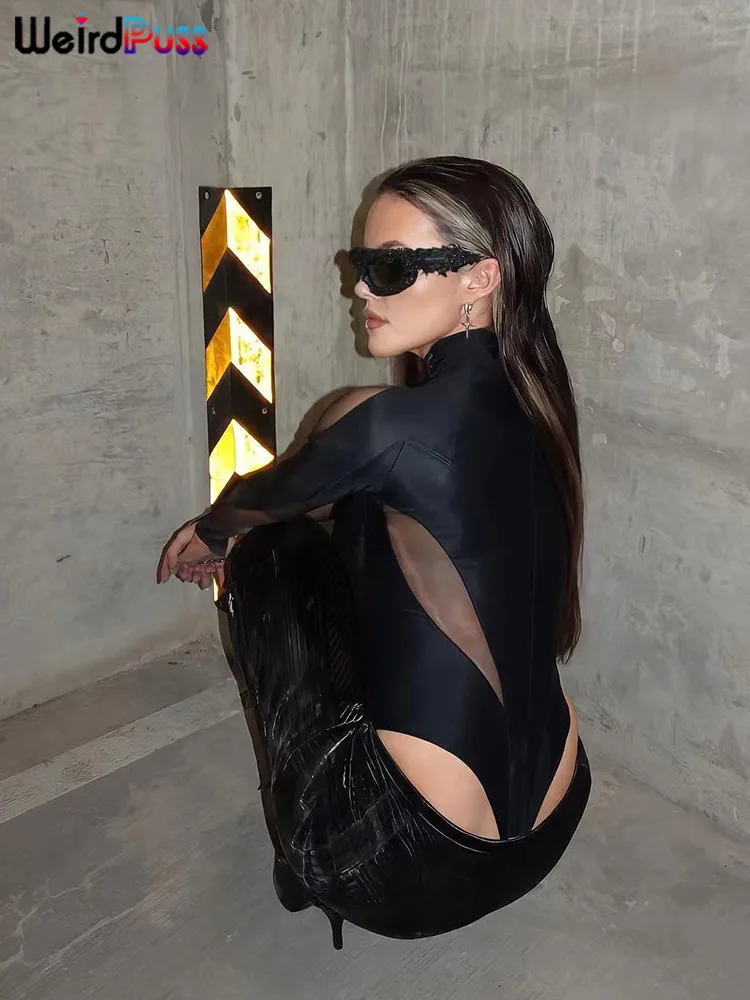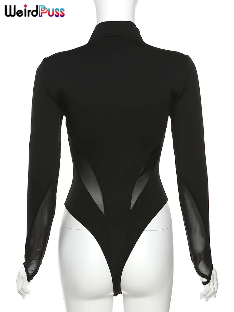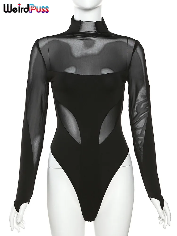 Weird Puss Sexy Wild Women Bodysuit Long Sleeve See Through Skinny Mesh Patchwork Vacation Party Club Streetwear Bodycon Tops