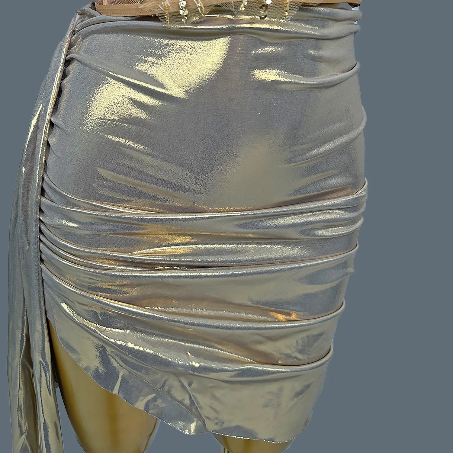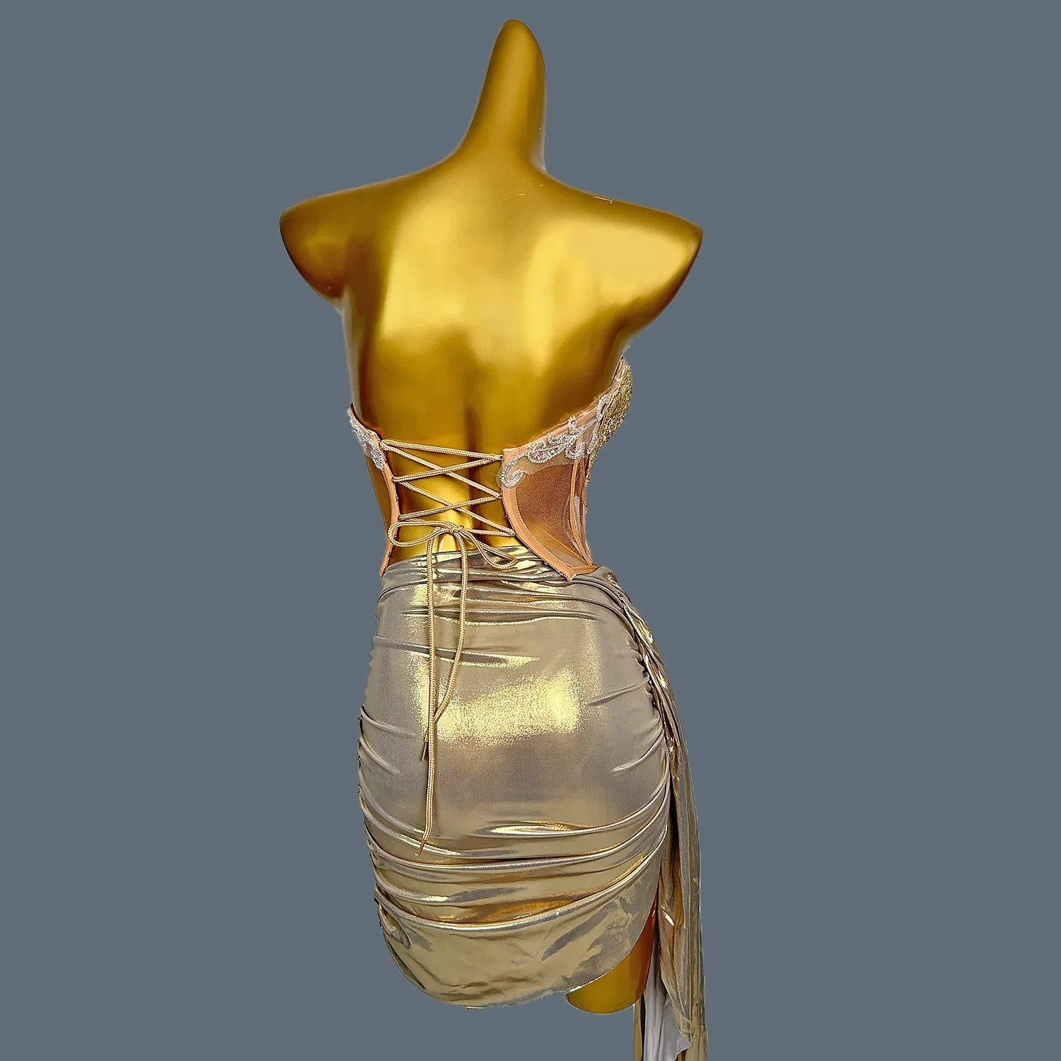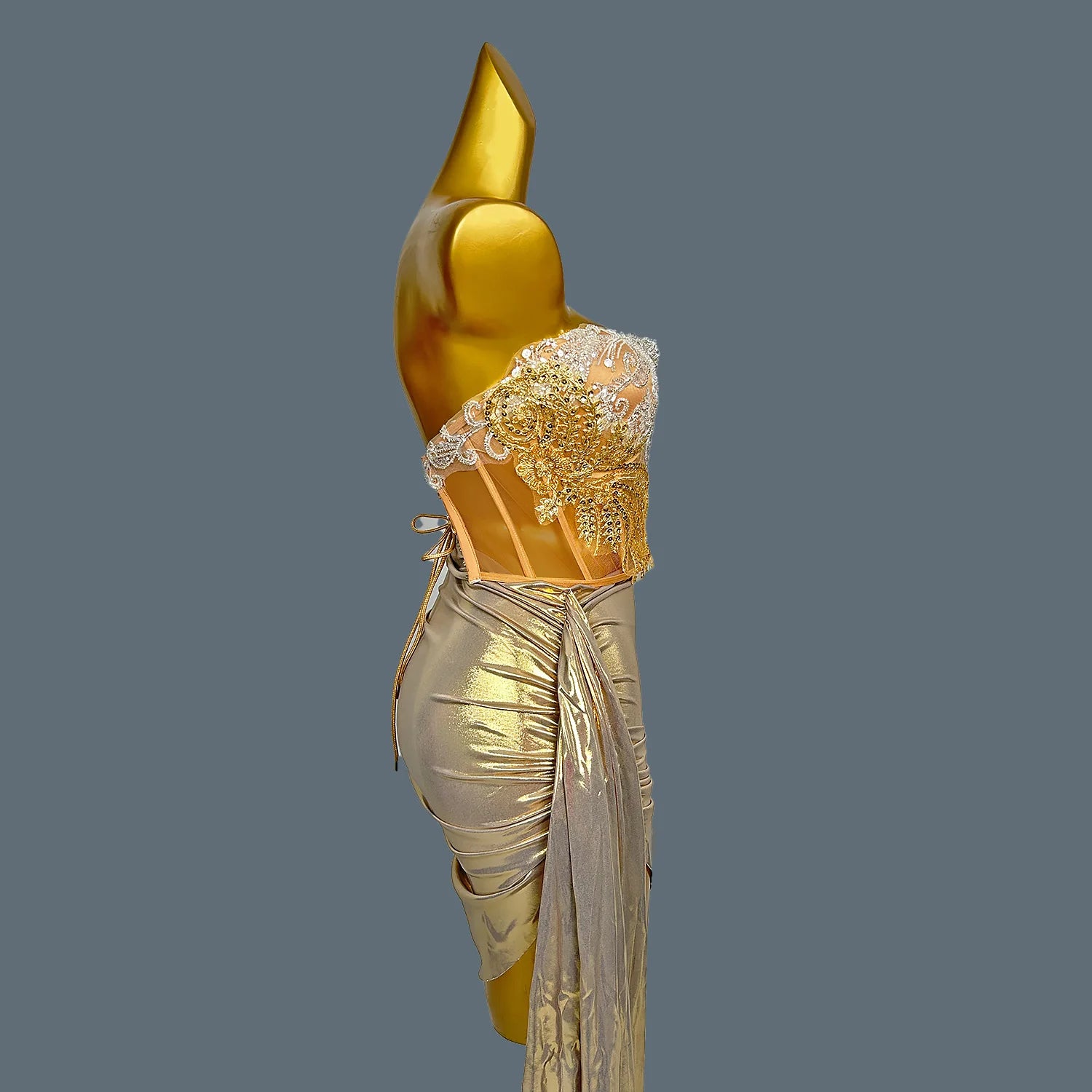 Women Glitter 2-Pieces Sets Top Short Skirt Sexy Strapless Sequins Crystal Luxury Gold Dress Design Stage Show Outfit