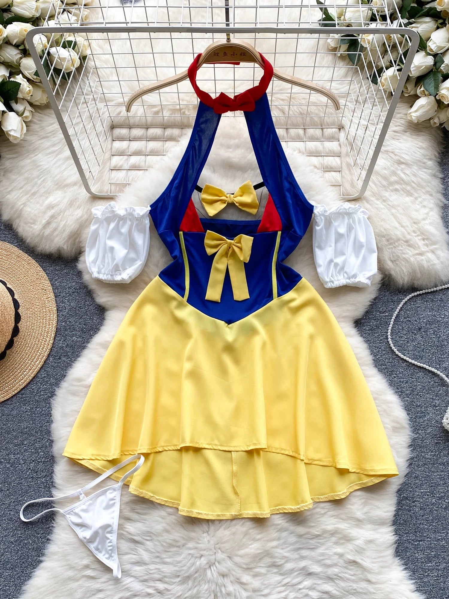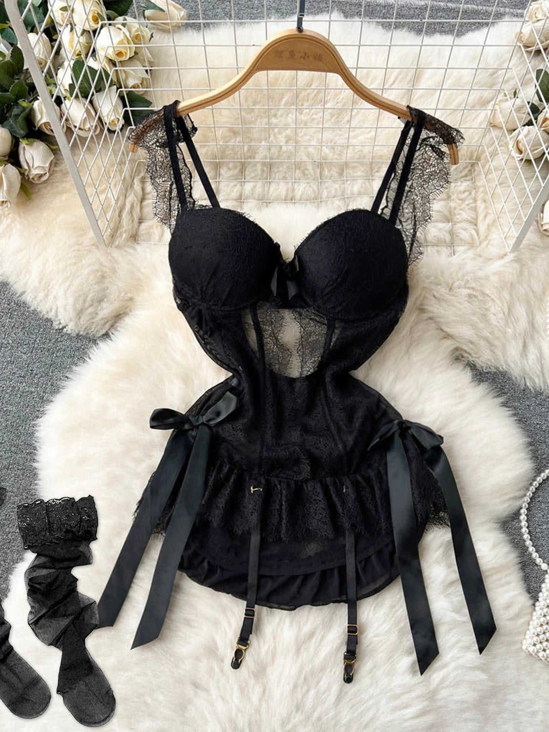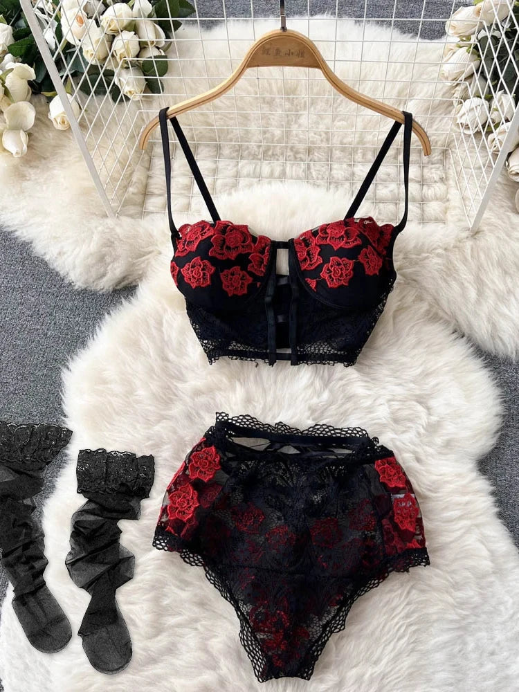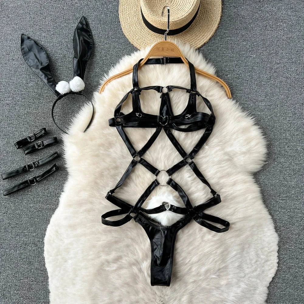 Women Preppy Style Sexy Uniform Sets 2024 V Neck Sheer Top+Lace Up Mini Skirt+Thongs Hollow Out Cosplay Porn Suits