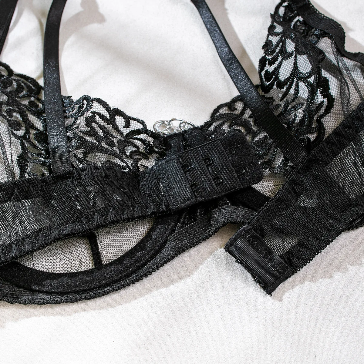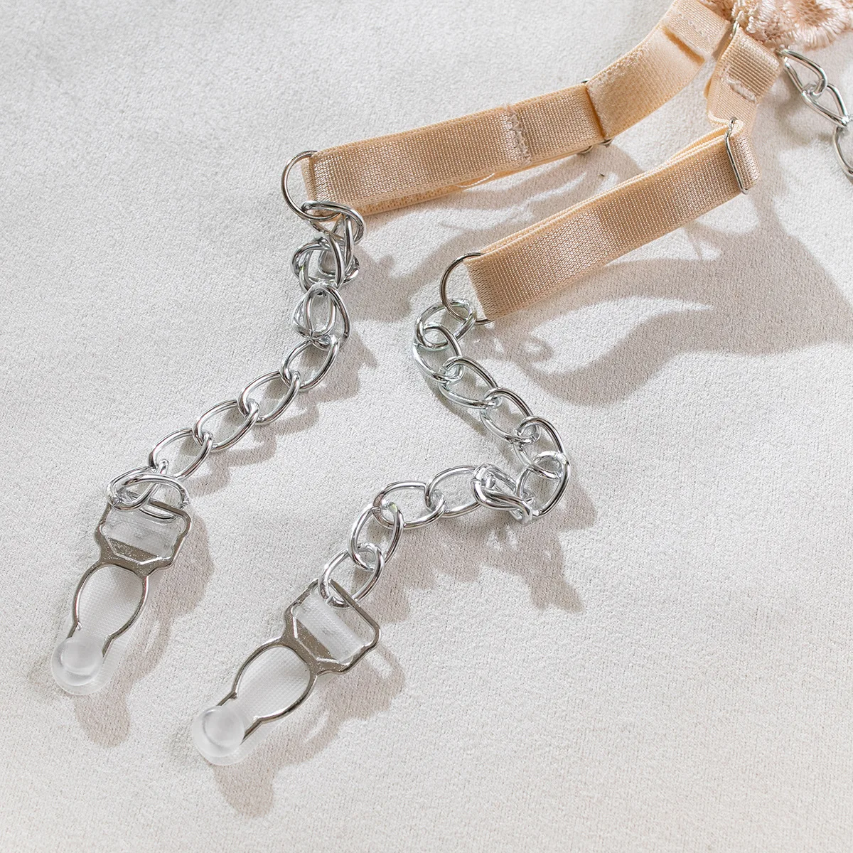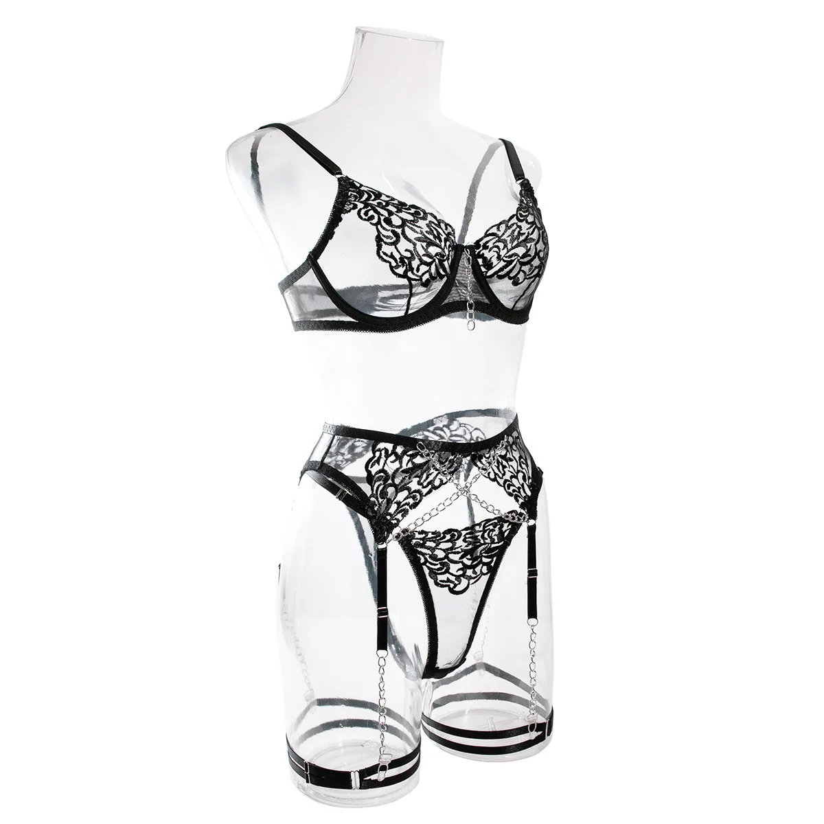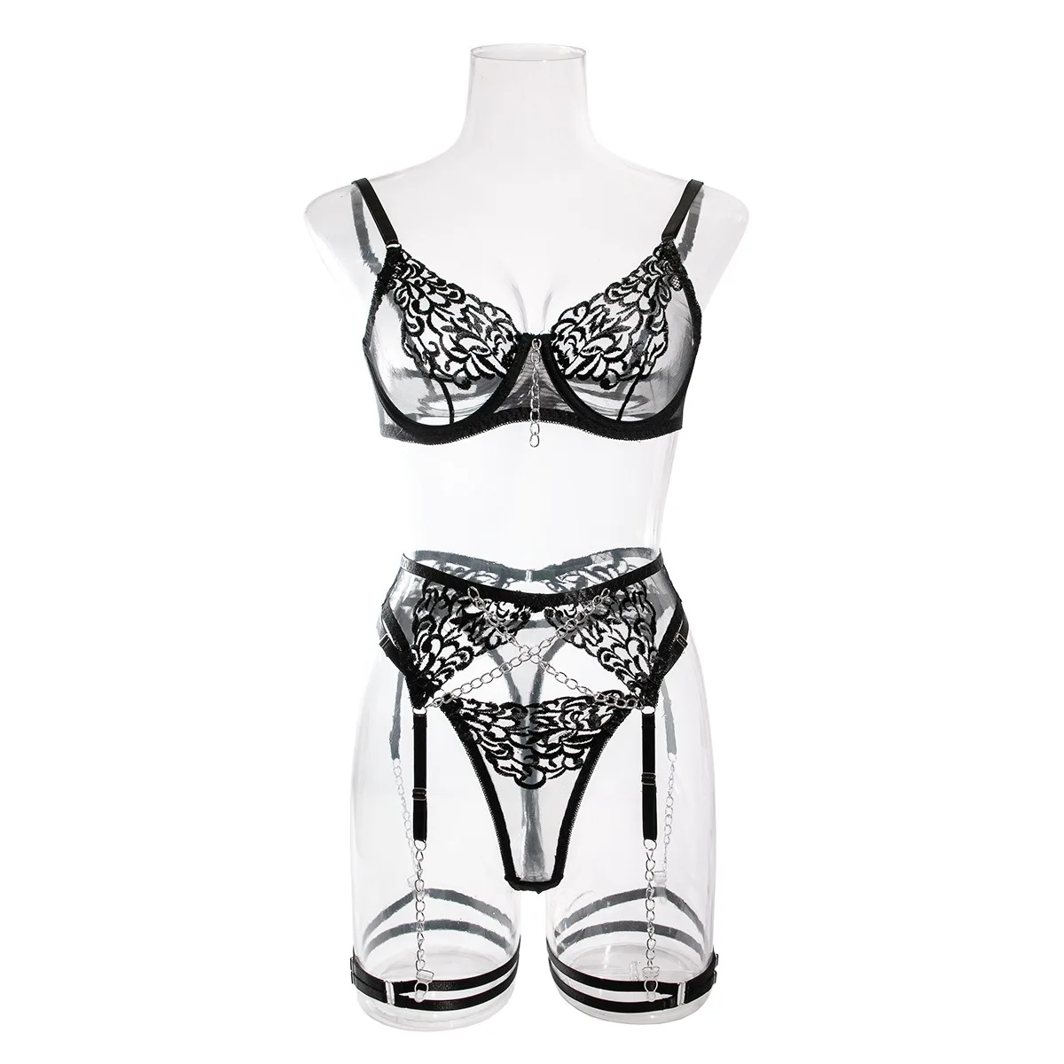 Yimunancy 3-Piece Embroidery Lingerie Set Women 3 Colors Sexy Erotic Set Fancy Chain Luxury Garter Kit