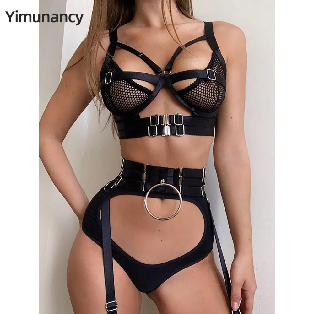 Yimunancy 3-Piece Transparent Gothic Exotic Set Women Cut Out Ring Bandage Sexy Lingerie Set Black Garter Brief Kit