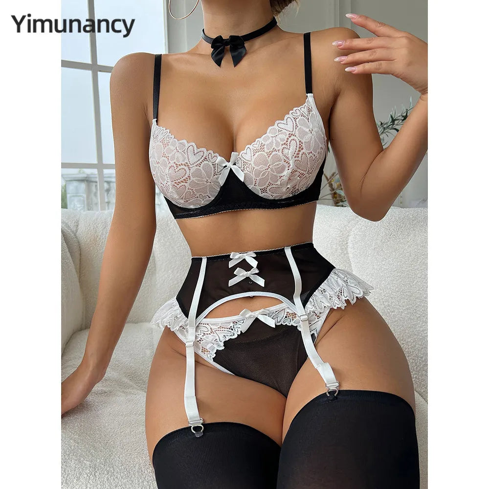 Yimunancy Bow Choker Maid Lace Patchwork Lingerie Set Women 5-Piece Ruched Ball Brief Garter Kit